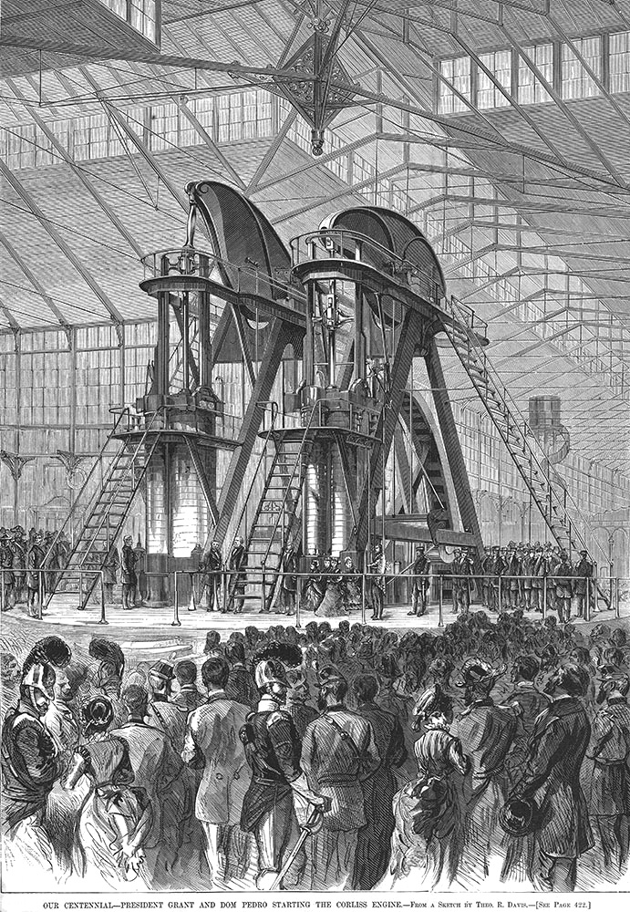 The buildings at the fair ranged in style from beaux arts to a Japanese temple, Moorish tents to Chinese pagodas. Fifteen countries (including England, Portugal, Sweden, Brazil, Japan, Egypt, Turkey, Chile, and Australia) built their own pavilions, as did twenty-six of the-then thirty-seven American states. The Machinery Hall, the second-largest building, elicited the most awe. Here, on the opening day, May 10, 1876, before a crowd of 110,000, President Ulysees S. Grant and Emperor Dom Pedro II of Brazil gave welcome speeches and then pulled a lever to start the George S. Corliss Steam Engine, a fourteen-hundred-horsepower behemoth made in Rhode Island that produced power for the entire building.