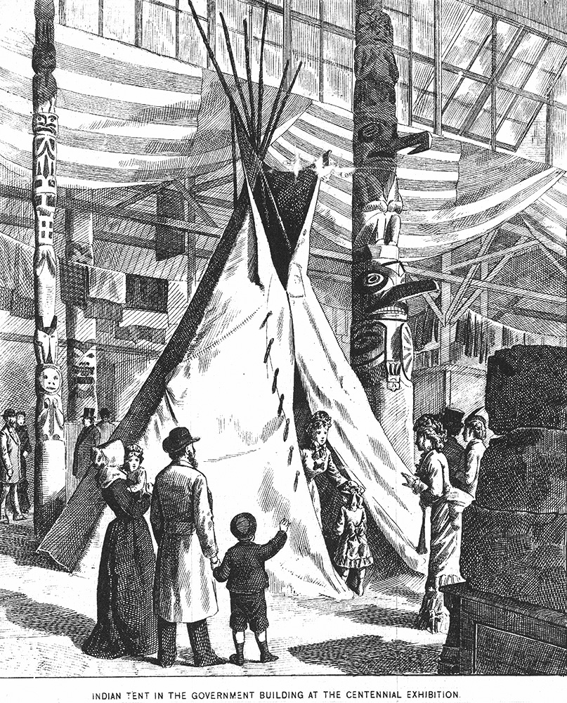 Another aspect of nostalgia at the fair extended to Native Americans, who were presented as exotic beings. In the Photography Building, a show of 126 oil paintings by the late George Catlin titled “Illustrations of Indian Life” depicted Native American tribesmen as they lived, hunted, and raised their families. The Tiffany & Company stand featured metalware sculptures of proud Native American chiefs. In the United States Government building a trove of artifacts on display included masks, pipes and tobacco pouches, pottery, bead and wampum work, clothing, charms, ornaments, tools and weapons—including a Hopi throwing stick, a wooden Haida ax, and a Sioux bow made of the sliced horns of mountain sheep. A towering totem pole from the Northwest was decorated with carvings of humans, frogs, beavers, and bears. There was also a genuine wigwam, sixteen feet in diameter, made of smoked buffalo skins, and a group of life-size mannequins (that looked suspiciously like cigar store Indians) wearing “Indian dress.”