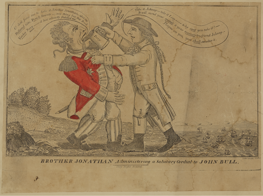 The Main Exhibition Building—reportedly the largest building in the world at the time—enclosed twenty-one acres under one roof. The architectural marvel was 464 feet wide by a central nave 1,876 feet long and seventy feet tall, with displays on mining, metallurgy, manufacturing, and science. A contemporary cartoon celebrating the Centennial featured the mighty “Brother Jonathan,” a precursor of Uncle Sam, straddling the towers of the building. Between his feet, the North American continent, crossed by a railroad, appears on a half globe, above which hot-air balloons labeled “1776” and “1876” rise in the sky.
