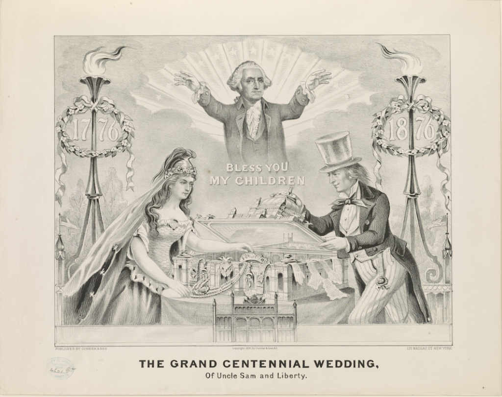“Though the Centennial was designed to celebrate the theme of progress, the historical exhibits ultimately had the effect of raising interest in and appreciation for America’s colonial past,” the Leslie Register concluded, noting “Americans’ increasing enthusiasm about collecting and preserving colonial furniture, ceramics, textiles and decorative arts.” In fact, it has been argued that the fair launched the colonial revival movement. The Grand Centennial Wedding, a popular Currier and Ives print of that year, symbolizes the moment, with a depiction of George Washington blessing the nuptials of Uncle Sam and Lady Liberty. At a time of upheaval and rapid change—rampant corruption in President Grant’s cabinet, strikes by union workers, boatloads of new immigrants sparking xenophobia, the end of Reconstruction, the financial panic that began in 1873, and a stolen presidential election in 1876—the citizenry welcomed the centennial celebration as a reverie of early America.