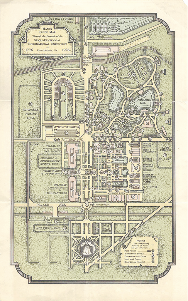 Two particular features of the Sesquicentennial plan established it firmly as a product of the Roaring Twenties. First were the midway-style entertainments and vendors, typically sited at a decorous remove in earlier expositions, but here integrated more fully into the design. This frank commercialism—and the traffic jams that clogged major events at the exposition grounds—earned the fair the (unflattering) nickname “Kendrick’s Karnival.”(4) And all those automobiles were a second sign of the times: a technology then reshaping American cities and identity alike. Broad streets accommodated the fleets of limousines of important visitors and large swaths of ground were devoted to parking, presaging the expanse of asphalt that now covers much of the site as Philadelphia’s present-day stadium district. With four hundred acres to accommodate around a hundred thousand vehicles, the Sesquicentennial’s parking space was nearly as large as the fairgrounds proper.(5) While streetcar lines and a temporary station of the Pennsylvania Railroad did serve the fairgrounds, the overall plan pointed to the increasingly central place of the car in American life.