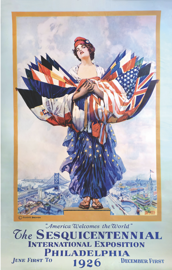 In its rocky path to realization, the Sesquicentennial mirrored the many contradictions of the 1920s United States. A humming economy and flourishing urban artistic communities sat uneasily alongside entrenched political machines, racial segregation, and rural poverty. The reach of film and radio connected more people than ever before, while strident anti-immigrant discourses divided them. The “Machine Age” seemed to offer a future of prosperity and convenience, even as industrial workers saw their working conditions deteriorate and their labor rights erode. Hints of these contradictions come through in a poster for the exposition, showing an allegorical America—complete with Phrygian cap denoting liberty and equality—standing above the engineering marvel of the Delaware River Bridge (today the Benjamin Franklin Bridge, completed in 1926 and dedicated as part of the Sesquicentennial celebration). The fictive classicizing cityscape is caught between historicism and modernity. The poster announces “America Welcomes the World”—but it was a provisional welcome only, as the immigration restrictions of the 1921 Emergency Quota Act and 1924 Asian Exclusion Act had made clear.