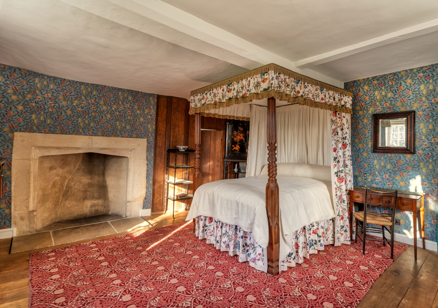 Fig. 13. Jane Morris’s bedroom features a handsome nineteenth-century carved tester bed. According to May Morris, this “was the bed in which [William] Morris was born, and it was given to him by his mother upon his coming to Kelmscott Manor.” The floral bed hangings, produced by Standfast and Barracks of Lancaster during the renovation, replicate a calico design printed in the late 1860s for Morris, Marshall, Faulkner, and Co.