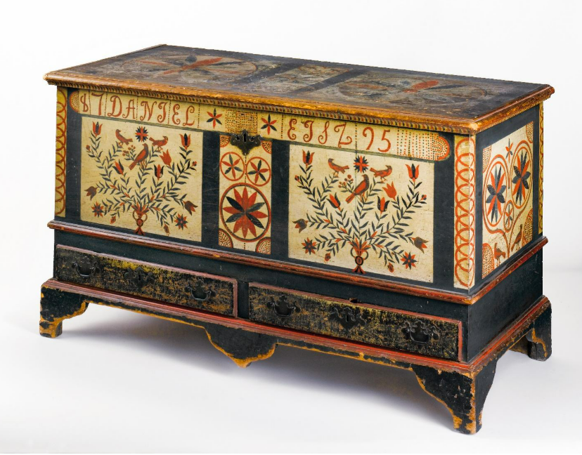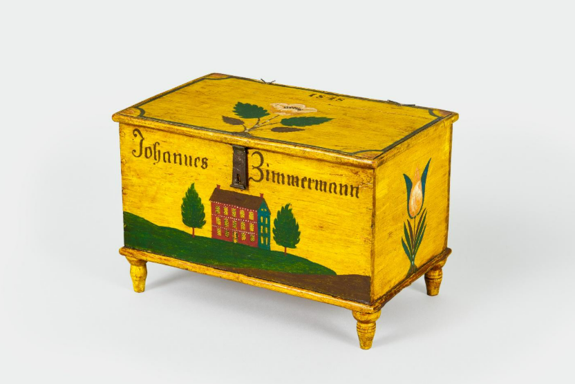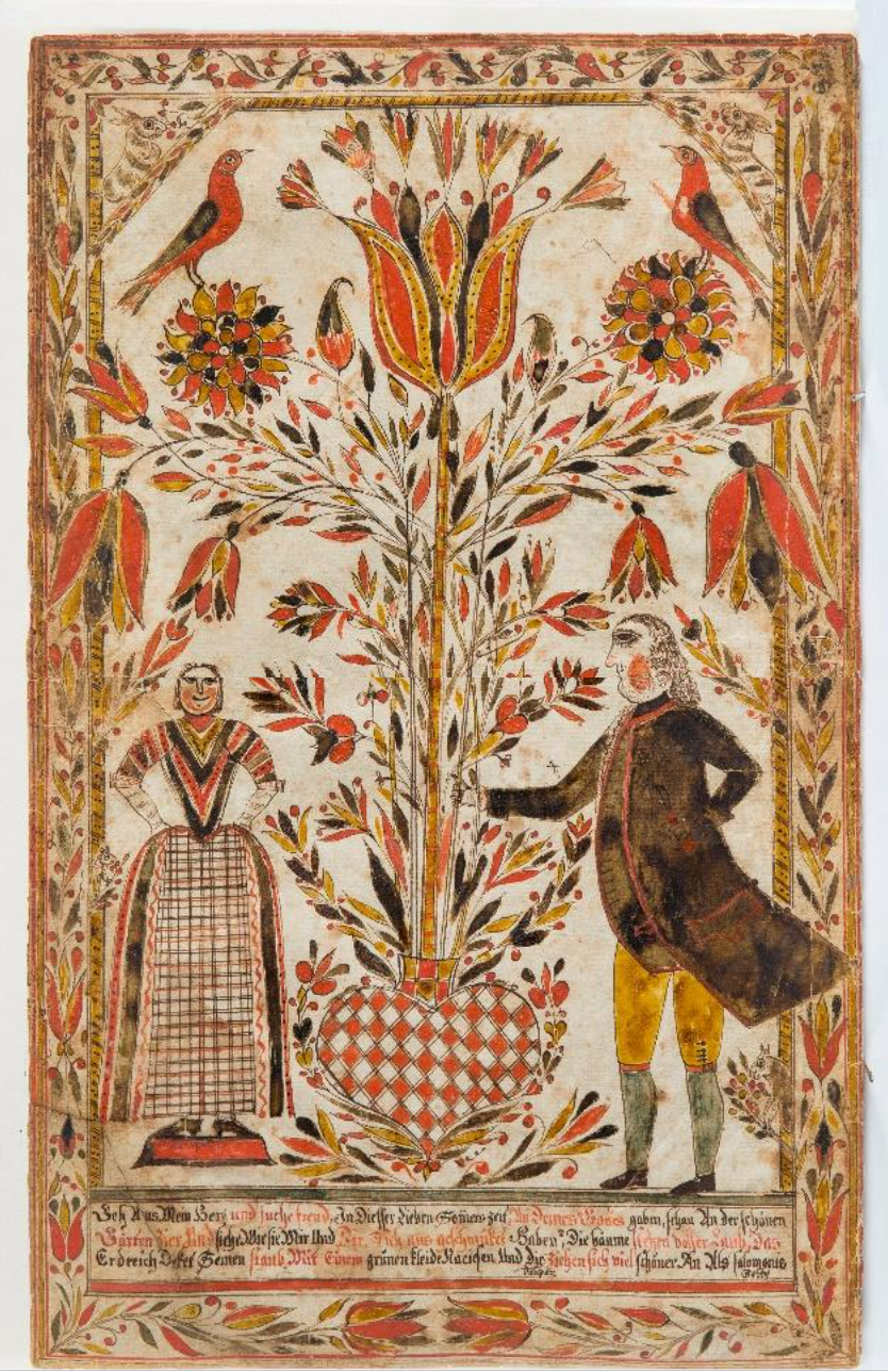 From the Perkiomen Valley of southeastern Pennsylvania to the Shenandoah Valley of Virginia, locally distinctive forms of material culture emerged. Drawn from nearly a dozen private and museum collections, the exhibition explores how German settlers transformed artifacts of daily life—including fraktur, painted furniture, boxes, and other artifacts—as they settled along the Great Wagon Road.