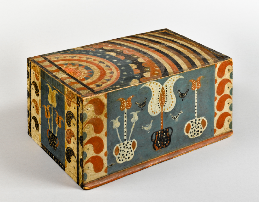 Sometimes the origins of the painted boxes and furniture featured in the exhibition remain unknown, but their design motifs relate to pieces made within the other valleys. A vibrant slide-lid box, covered in decoration on every visible surface, had its designs first laid out and then carefully incised into the wood before being executed in paint. The lid is decorated with curving lines in alternating red, white, and blue colors; the sides feature tulips within two-handled vases and chickens embellished with polka dots.