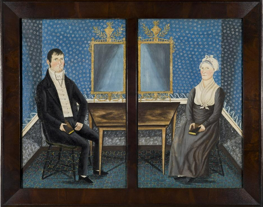 One of the most important portraits to come out of the valley was done by itinerant artist Jacob Maentel. John and Caterina Bickel’s portraits showcase the vibrant interior of their home in Jonestown, Lebanon County, with brilliant blue walls covered in tiny white flowers. John Bickel (1775–1863) was the postmaster of Jonestown for fifty-seven years; he retired in 1859 as the oldest postmaster in the United States. Maentel was a German immigrant who appears to have first settled in Baltimore, where he is listed as a “Portrait Painter” in the 1807 city directory. He soon moved to Pennsylvania and became a prolific artist, first working in simpler profile portraits before attempting frontal compositions and elaborate interiors. Sometime after 1830 he moved west, settling in New Harmony, Indiana.