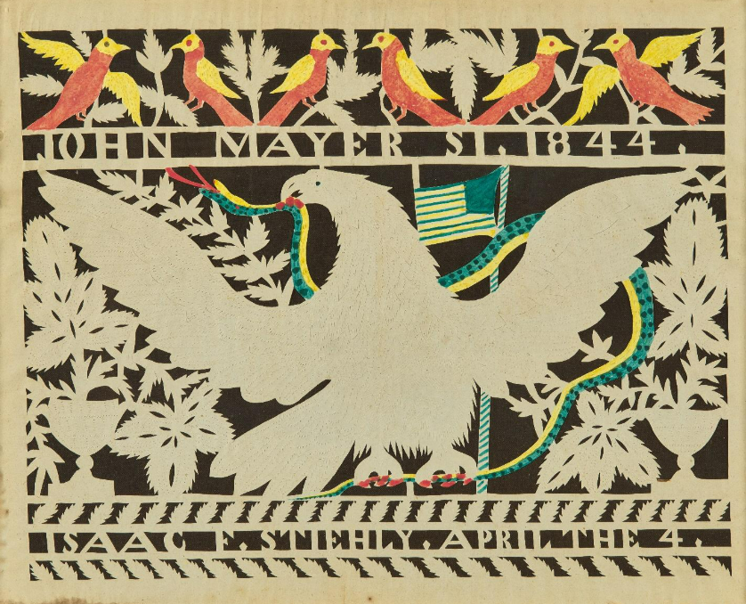 The chest descended in the family of Nathan Knorr and Anna Mayer (1838–1903). Anna’s father John Mayer (1794–1883) was the likely the decorator of much of the furniture to come out of the Mahantongo Valley. Isaac Faust Stiehly (1800–1869) related to the Mayers by marriage, made two cutworks, known as Scherenschnitte (scissor-cuttings) in German, for Anna and John Mayer. Embellished with hand-colored details, they feature a large spread-wing eagle grasping a snake in its beak and talons and flanked by an American flag. Across the bottom, Stiehly included his name and the date; at the top is the recipient’s name and the year each piece was made.