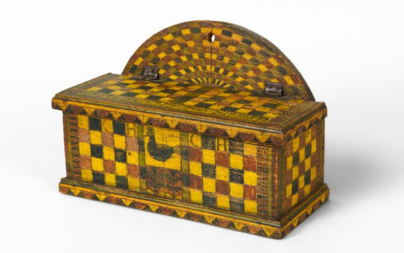 The maker of this noted group of painted boxes and furniture is unknown, but their characteristic checkerboard decoration sets the group apart from others by identifiable Pennsylvania German makers. Additional distinguishing features include the use of deeply incised lines scored into the wood before the paint was applied to create a dazzling array of shapes and color combinations. The designs are abstract in nature, with spiky tulips and other flowers. Inscribed on the lid “Chrisdina x Hoffmann A 1841” and on the front panel “CH CH,” a hanging box made for Christina Hoffmann is the only known example to bear a name or initials. Hoffman is a common surname in Somerset County, making it difficult to identify a specific individual.