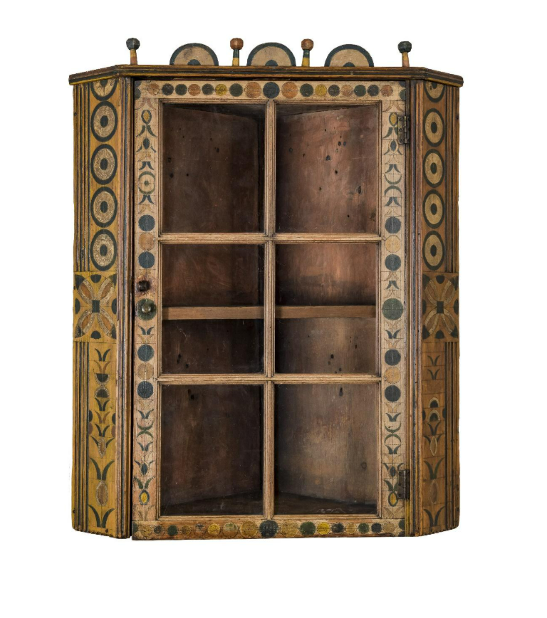 The artist also produced a hanging corner cupboard—the only known example of its form within the distinctive group of painted boxes and furniture made in Somerset County (fig 12). The stylized geometric designs and rows of spiky tulips are also seen on smaller boxes within this group. The finials at the top are restored but match the surviving evidence on the cornice. Chip carving at the bottom of the stiles flanking the door is identical to that found on some of the smaller boxes.