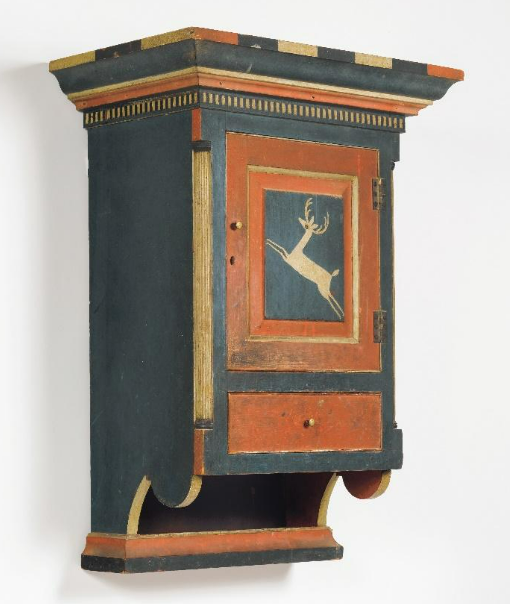 Both natives of the predominantly Mennonite settlement in Massanutten, Virginia, Johannes Spitler (1774–1837) and Jacob Strickler (1770–1842) are two of the Shenandoah Valley’s most famous artists. Primarily a farmer, Spitler also decoratively painted furniture, including multiple chests, two tall case clocks, and a hanging cupboard (fig. 13). The hanging wall cupboard was discovered in a closet in the home of Jesse T. Modisett (1904–1998), a descendant of fraktur artist Jacob Strickler. It is the only known example of this form made by Johannes Spitler. Spitler’s work is immediately recognizable by its use of bold, often abstract designs and strong color palette of blue, red, and white.