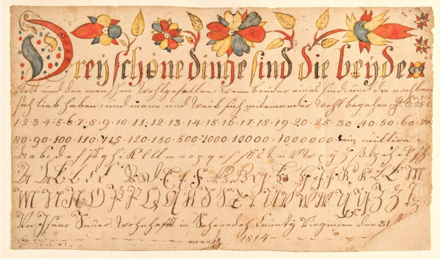 Jacob Strickler was a schoolmaster and fraktur artist who lived near Johannes Spitler. His earliest surviving work is dated 1787; Strickler produced different types of fraktur such as birth records, religious texts, and writing samples. Across the bottom of this Vorschrift, or writing sample, is the inscription (translation): “For Isaac Sauer living in Shenandoah County Virginia the 31st March 1814.” Isaac was the son of Balzer Sour (Sauer) (d. 1821), a Lutheran member of the Hawksbill Church near Luray in Shenandoah (now Page) County. Some of Strickler’s designs bear a striking similarity to those used on Johannes Spitler’s furniture, leading to speculation that the two artists may have collaborated from time to time.