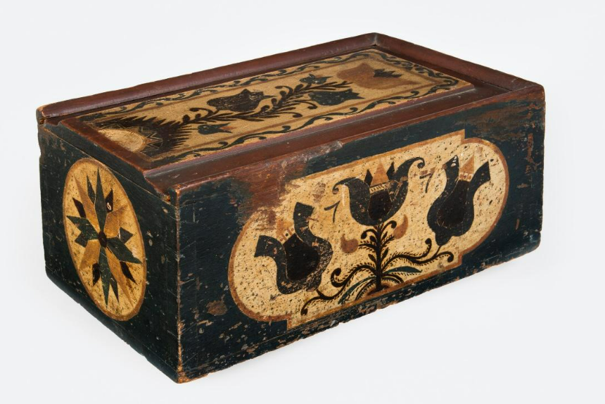An extraordinary slide-lid box on view is one of the finest and best-preserved examples of an iconic group of painted furniture from Berks County. The box is decorated on the lid and three sides with tulips, vines, and a large compass star. It is one of seven known examples of slide-lid boxes and miniature chests by this decorator, who also painted full-size chests embellished with black unicorns or horse-and-riders.