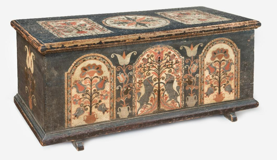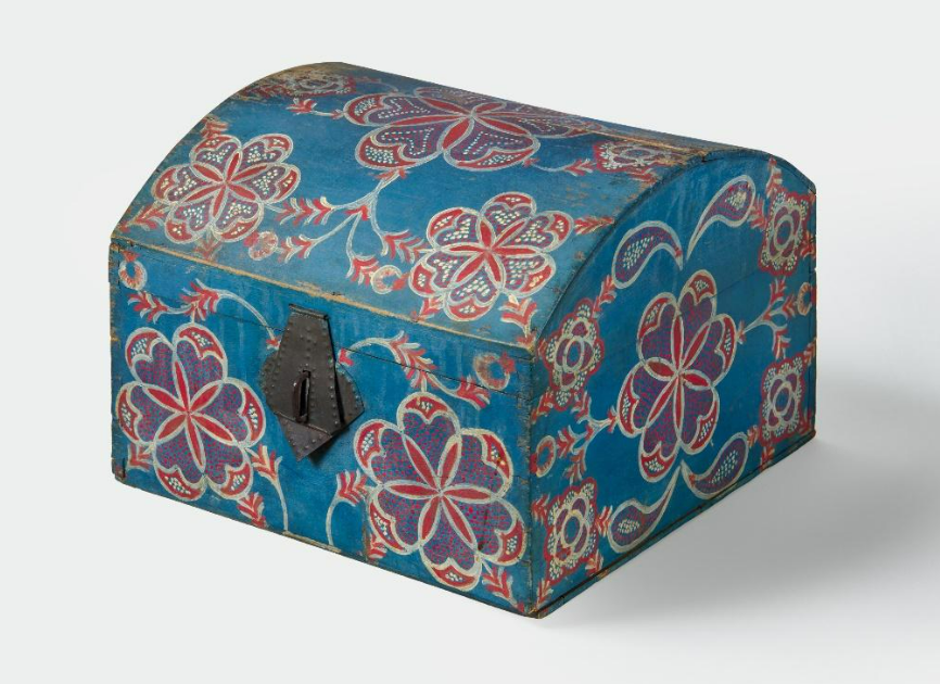 Despite its extraordinary decoration, this box is the only known period example featuring these motifs. It was first published in the July 1925 issue of The Magazine Antiques in a two-part article on “Pennsylvania Brides Boxes and Dower Chests” by the pioneering scholar Esther Stevens Brazer (1898–1945), an interior decorator, teacher, and author of Early American Decoration (1940). Her legacy inspired the founding of the Historical Society of Early American Decoration in 1946.