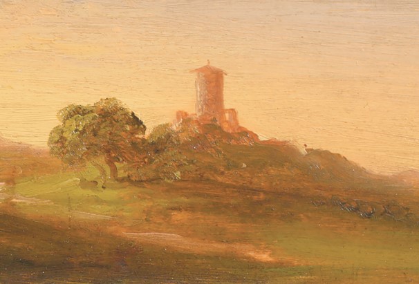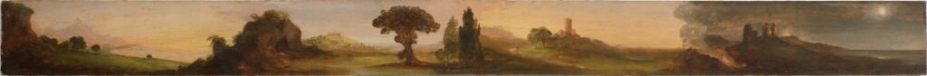 Even Thomas Cole, the founding father of the American landscape tradition, took part in the miniature game. His Italian Scenery at Four Times of Day (Figs. 7, 7a, 7b) is a tour de force of painting—and it’s only four inches high. On a long rectangular panel, Cole experimented with the changing light effects of dawn, midday, dusk, and night. Much like the popular moving panoramas that traveled from city to city during the nineteenth century, the composition reveals the artist’s interest in understanding and visualizing the progression of time.