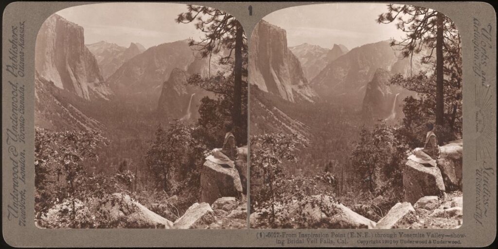 One of the best-known formats for early landscape photography, stereography, generated diminutive images designed to inspire a similar kind of focus. Stereographers used a special camera to capture a view from two ever-so-slightly-different angles so that, when examined through a special viewing instrument called a stereoscope, the two flat images are made to appear as a single three-dimensional object (Fig. 5). Stereographs, like other miniature landscapes, were designed to inspire deep focus, creating a transportive encounter between object and viewer.