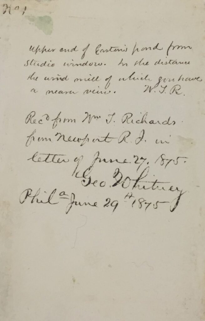 Working in a vein similar to Duncanson, in 1875 William Trost Richards painted his first miniature watercolor in what would become a ten-year series (Fig. 12a). These three-by-four-inch cards were made for the artist’s patron, George Whitney (see Fig. 12b). Sent through the mail, the “coupons,” as the artist dubbed them, facilitated a rich ongoing exchange between artist and patron by, as the art historian Kimia Shahi has explained, “providing Whitney with mobile ‘samples’ of Richards’s work while the artist was away from his studio in Philadelphia, where both men primarily resided.”9 Like financial coupons, they were exchanged as a kind of currency, repayment by the artist for the funding he received from his patron. Often, Whitney would “cash in” on a miniature composition, commissioning a large-scale painting based on the little pictures he previewed.