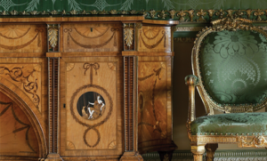 Diana and Minerva commode (with detail) by Thomas Chippendale, 1773, shown in the State Bedroom, Harewood House, Yorkshire. Harewood House Trust.