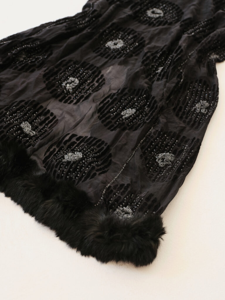 But I finally found a really good one last year: sheer and long—that true flapper length, three or so inches above your ankle—with a silhouette as straight and as imaginative as an ironing board. It is covered in these enormous circles of bobbling glass beads, but the detail de résistance is a rather ragged, mean rabbit fur hem. This thing actually flapped.
