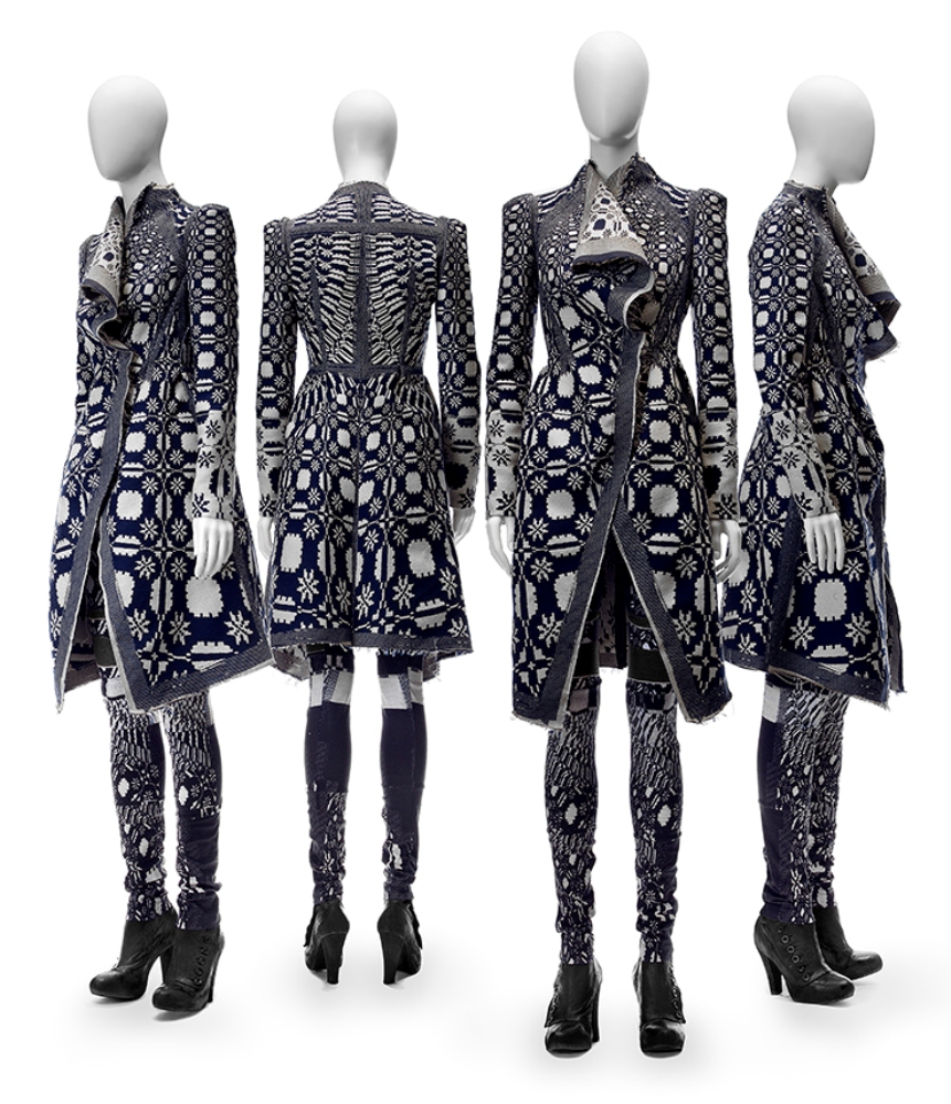 Jacquard coats and leggings designed by Graham (1969- ), 2013. Graham reimagined the Ann Carll coverlet as a jacquard and had the fabric woven on a loom at the Rhode Island School of Design. Photograph by Mete Ozeren, courtesy of the American Folk ArtMuseum.