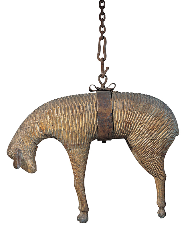 The art and objects in Multitudes are arranged thematically and by type. There’s an excellent group of trade signs and figures—including a mid-nineteenthcentury hanging sheep sign that must have looked even more striking with its original covering of gold leaf. There are also wonderful arrays of whimsy bottles— tiny glass vessels holding hand-carved figures and such, in the manner of ships in a bottle—and of wooden decoys and quilts. Some marvelous examples of schoolgirl crafts are also on view, notably a trinket box decorated with watercolor portraits under glass made around 1825 in Portsmouth, New Hampshire.