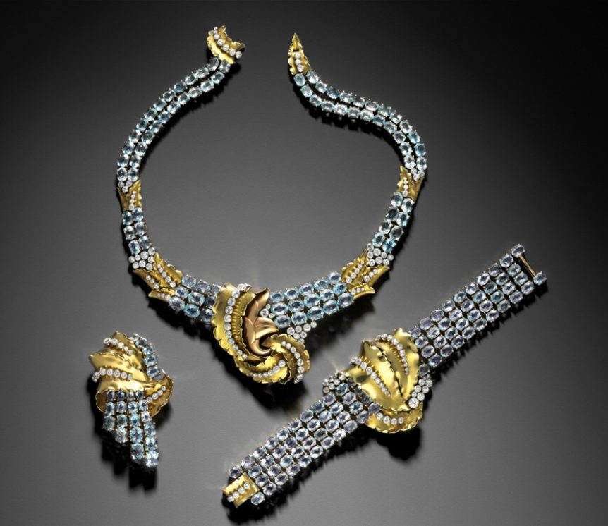 Joan Crawford amassed a substantial collection of jewelry from the 1930s through the 1950s when the predominant style was large and bold. The subtle laciness and lush refinement of Belle Époque Cartier designs such as Grace (Mrs. Cornelius III) Vanderbilt wore in the 1910s and 1920s were not for her. According to Stefano Papi and Alexandra Rhodes in Famous Jewelry Collectors, Crawford’s “glamorous looks were the perfect canvas for designer clothes and designer jewels.”5 One of her favorite parures was the aquamarine and diamond suite consisting of necklace, bracelet, and brooch by the French jeweler Verger Frères,6 and retailed by E. H. Tompkins of New York (Fig. 1). She was often photographed wearing this suite, as in promotional stills for the 1939 movie The Women.
