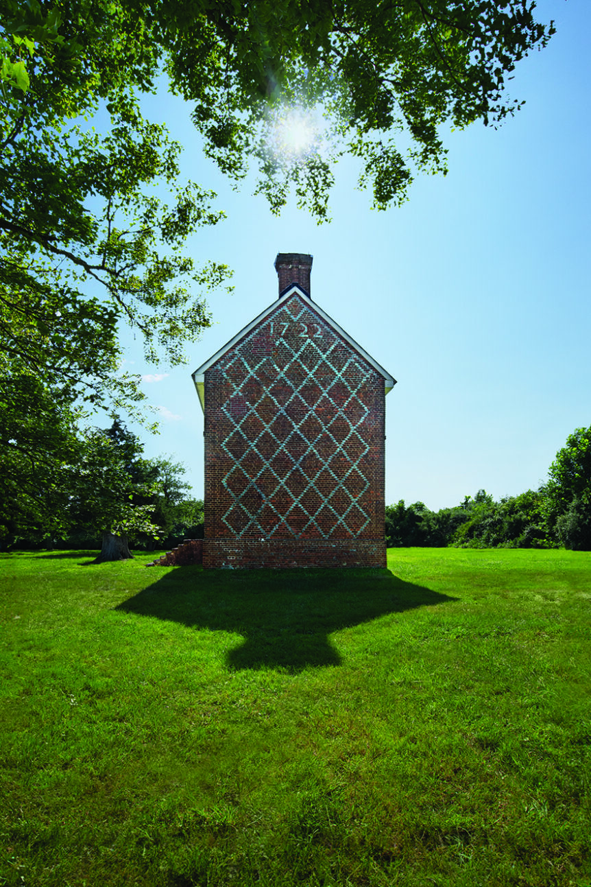 Despite its Quaker origins, the Nicholson House was a grand and highly decorated dwelling for its time. It could be seen for miles twinkling in the sun. There is a flawed understanding of Quaker plainness, but Quakers embraced and appreciated monumentality, durability, craftsmanship, and careful elaboration. The cynosure of the house is certainly the brickwork. The east wall is emblazoned with a complex pattern of forty-five diamonds and the year of construction, 1722, boldly inlaid in bright headers. While this wall is in traditional English bond, a favorite of seventeenth-century colonial builders, the other three are in bristling checkerboard-patterned Flemish bond. The shiny glazed, or vitrified, headers—the short ends of bricks—were a hallmark of the Quaker diaspora up and down the East Coast.