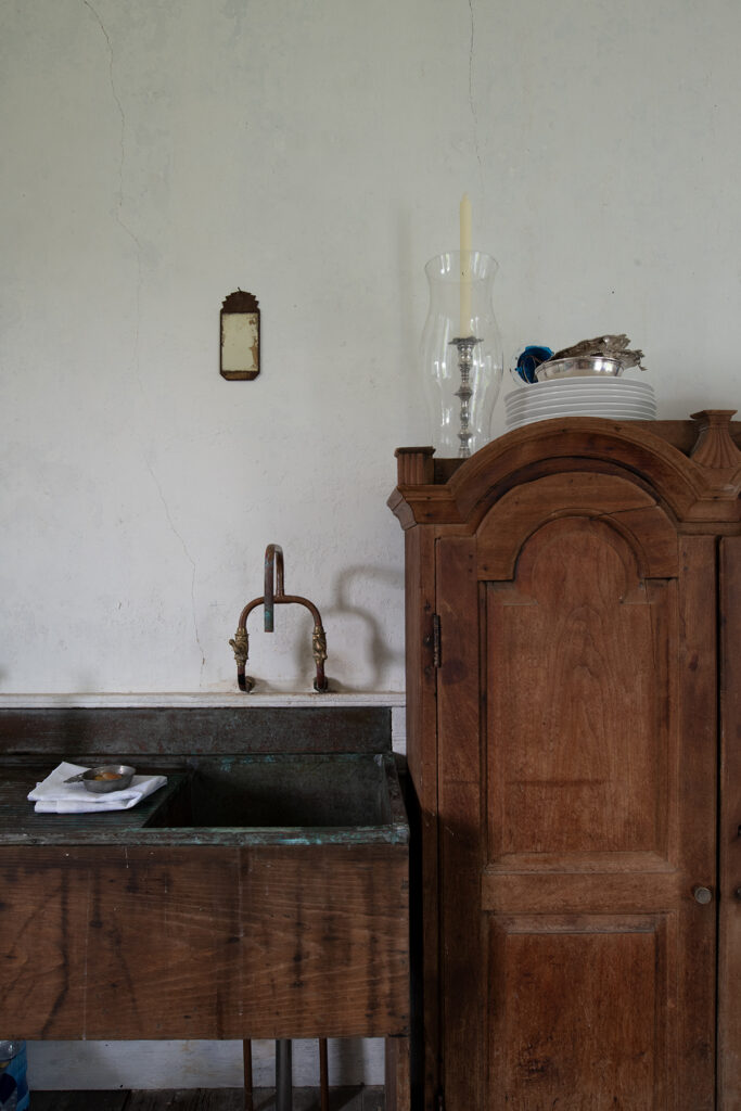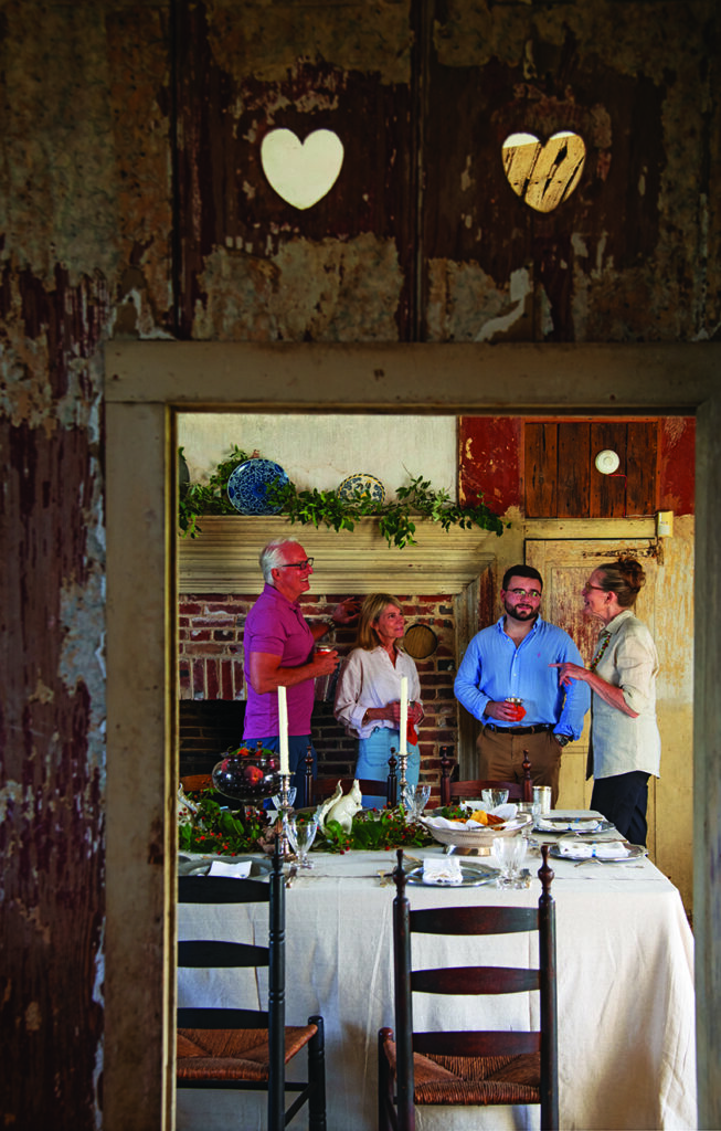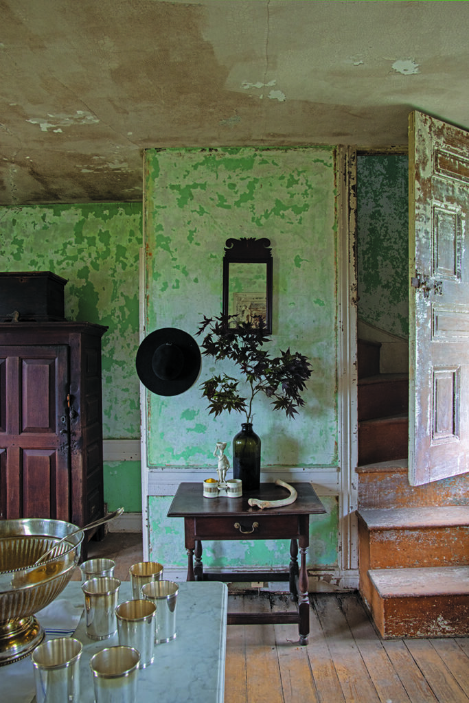 Additionally, the water is non-potable, and a drain field cannot be installed, so no one can live in the house. It can’t be a museum or open to the public. The lane often floods at high tide, so the property cannot be reached or visited on a regular basis. There is nowhere for parking, and handicap accessibility is out of the question. And who but a crazy person would preserve it with missing plaster, open ceilings, and many voids for snakes and creatures, large and small, to creep in? The goal of the nonprofit foundation is to secure and stabilize the house, protecting it from water, weather, and further deterioration. Our philosophy is strictly preservation. No restoration. Even the aluminum storm door is kept! We did repaint the nineteenth-century kitchen in its original colors after an unfortunate lightning fire and have lightly furnished some rooms for convenience.