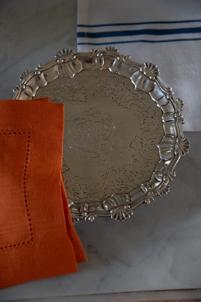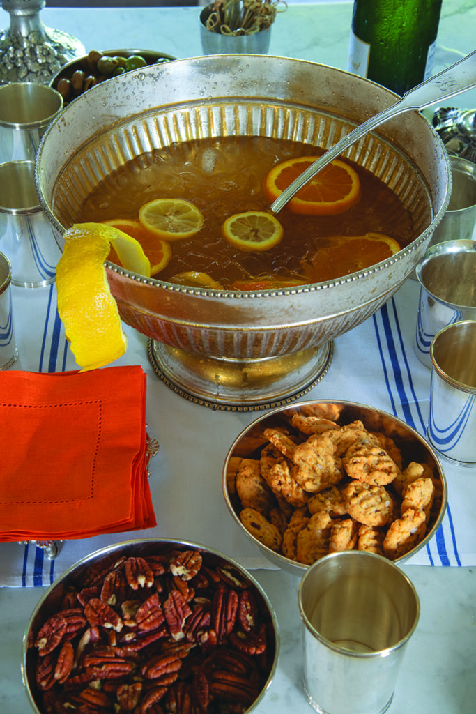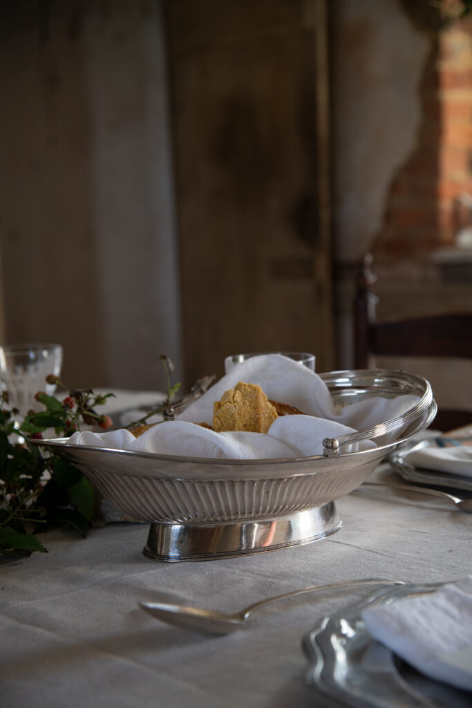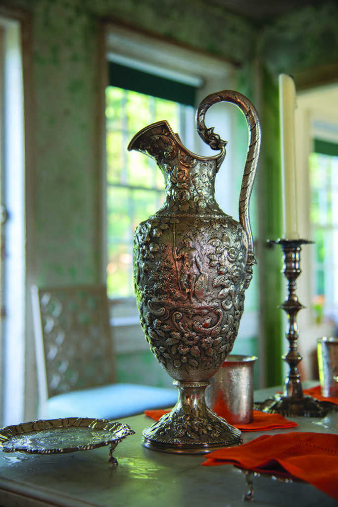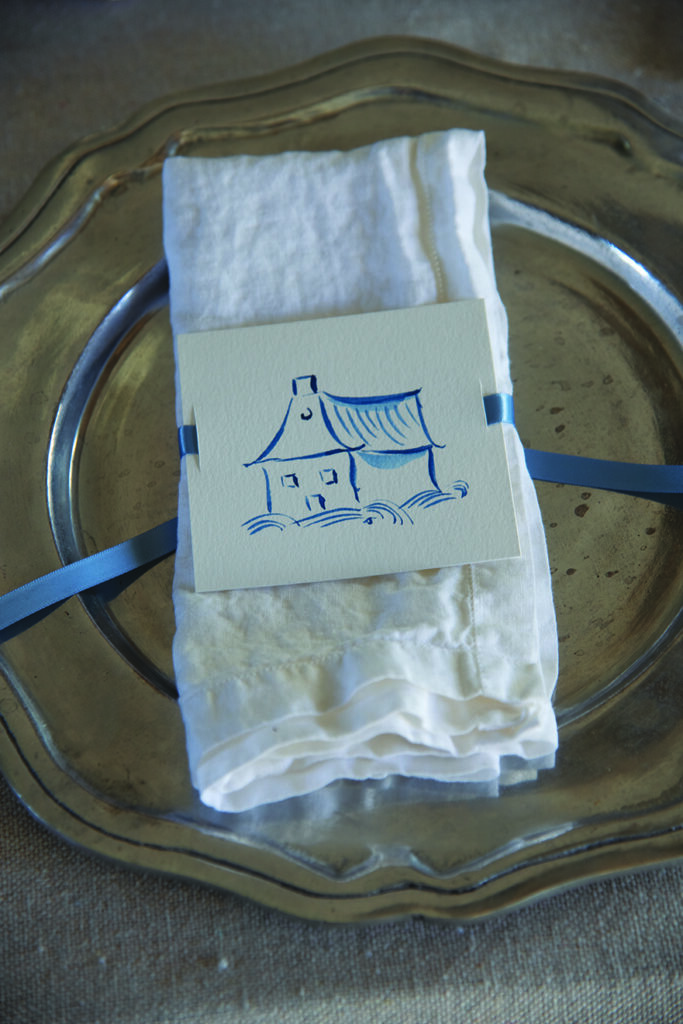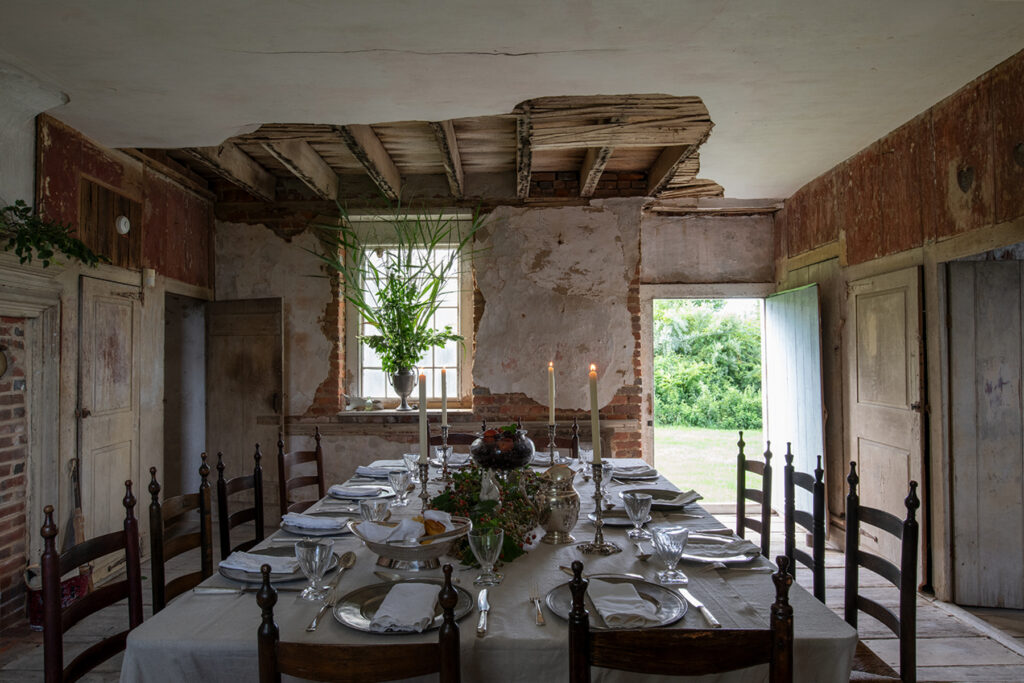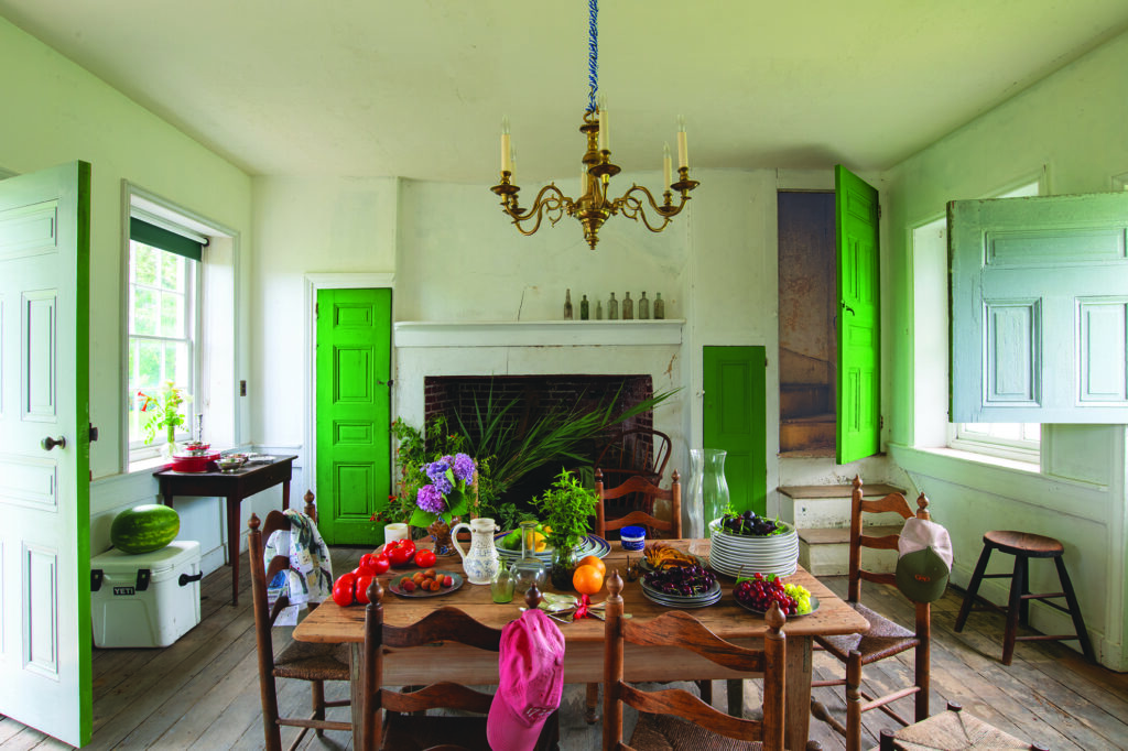 Everything needs to be brought in. We wash dishes in a basin outside, just like the old days. No stove. Guest editor Pieter Estersohn came to experience one of our little celebrations on a hot June night, with breezes whipping the table cover and blowing out the candles. We went for an evocation of an eighteenth-century dinner overlaid with wit and humor. Canvas drop cloths covered the table, and blue-ribboned place cards painted by Amanda Kimball, along with greens from the fields and woods, trumpet vines, and blackberry brambles (thank you Kanin), decorated the table and windowsills. I fortified everyone with my special eighteenth-century bourbon-heavy Artillery Punch—in silver cups. And we enjoyed a simple gallimaufry of salads—tomato, potato, and anise—plus fried chicken and corn pones, but on Canton and Delft plates. Will brought Georgian silver, Clifford made a dreamy pavlova with fresh fruit, Todd brought banana bread, everyone brought wine and champagne. It was a resplendent dinner.