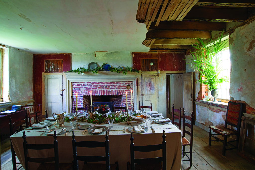 In addition, the T-shaped chimneys have an extra wythe, or pilaster, as well as plaster necking bands, both skeuomorphs for past necessities. The main room, or hall, is an unabashedly grand theater for display. Originally the entire room—plaster and woodwork—were painted a serviceable pinkish dark red that may have been inspired by cedar.