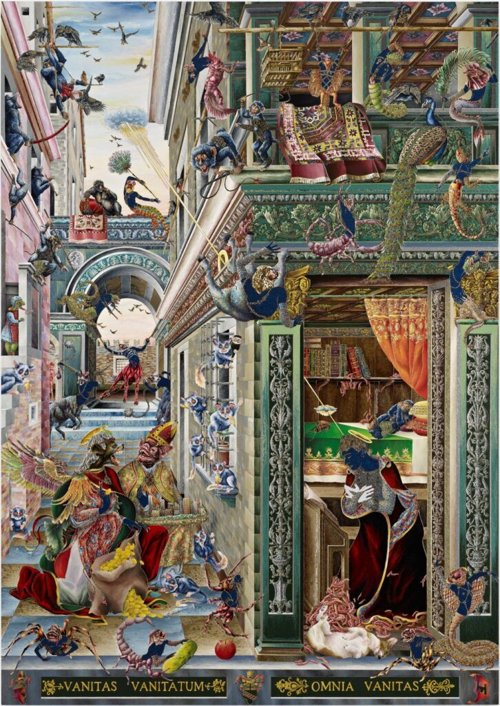 Shaw’s work also pays homage to the artists that inspired his career, and he often intertwines these references in humorous fashion. The Annunciation (After Carlo Crivelli) (2013-2014) recreates Crivelli’s famous altarpiece but envisioned through a chaotic scene of Asian wild animals and hybrids performing acts related to the seven deadly sins. Among this commotion is the Virgin Mary, colored in the divine blue hue of Hindu god depictions, praying as she is being impregnated by the famous UFO-like angel. Similar to the “libertas ecclesiae” (church liberty) that is carved in stone in Crivelli’s altarpiece, the Latin phrase “vanitas vanitatum et omnia vanitas” (vanity of vanities; everything is vanity) at the bottom of Shaw’s artwork sets the mood.