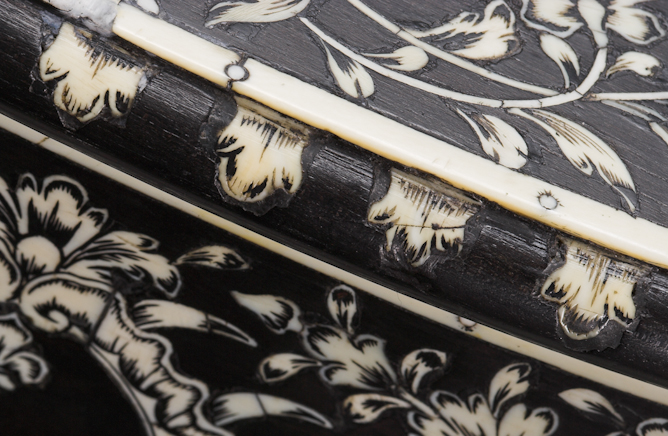 Made in Vizagapatam, India, the chair’s form closely follows European examples of the mid-eighteenth century. Vizagapatam (now Vishakhapatnam) was the most important harbor between Calcutta and Madras on India’s eastern Coromandel Coast. This thriving port city was a major center for the production of west­ern style furniture as early as the 1600s. Vizagapatam craftsmen were particularly noted for their skill with inlaid and veneered ivory. These artists often engraved ivory, filling the lines with a black resinous paste known as lac to create boldly con­trasting designs against the white ground.