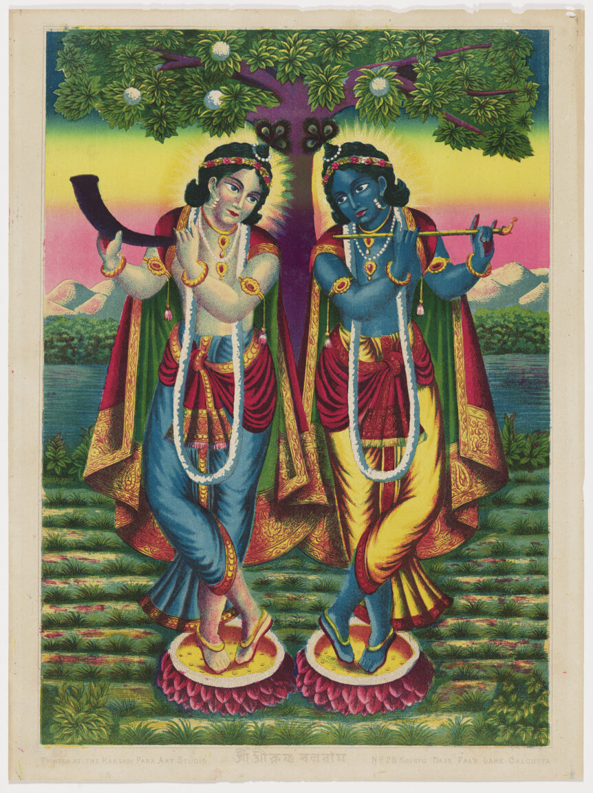 Sri Sri Krishna Balarama, chromolithograph published byKansaripara Art Studio, c. 1910–1920. The objects illustrated are in
