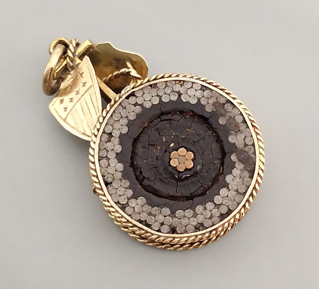 In other cases, an ornament revealed a public affilation. One of the first and most significant political groups in America was the Society of the Cincinnati, formed after George Washington voluntarily gave up his military commission at the conclusion of the Revolutionary War. The name was inspired by the Roman patrician and military leader Lucius Quinctius Cincinnatus, who relinquished his rule of Rome to pursue a life as a farmer. Washington, like Cincinnatus, was highly regarded for placing public service over personal gain. The society was formed in 1783 by a group of military officers who served in the Revolutionary War, and their motto, Omnia reliquit servare rem publican (“He gave up everything to serve the republic”) linked Washington’s career with that of Cincinnatus. Its first medals were produced in France in the same year, to designs provided by the French-born artist and Continental Army officer Pierre-Charles L’Enfant. Featuring downturned wings and with olive branches in its talons, the eagle symbolizes the peacefulness of the American republic in the aftermath of the revolution. The early example seen here lacks the original blue and white ribbon that stood for the French alliance in the war. Because it is a hereditary organization, the society’s medal has been officially reproduced numerous times for the descendants of its original recipients by American jewelry firms.