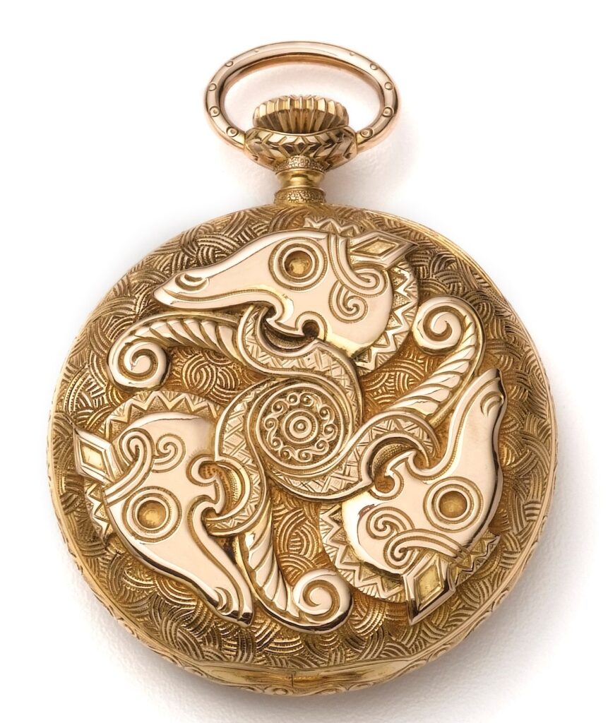 By the late nineteenth century men were beginning to embrace greater ornamentation in their personal accessories, particularly where pocket watches were concerned. A standard item in the male wardrobe, usually accompanied by a watch fob and a showy watch chain, a watch case could support a variety of lively designs and yet remain quietly out of sight except when needed. One example by Tiffany and Company boasts a robust interpretation of the Celtic style. With the successful installation of Cyrus Fields’s transatlantic telegraph cable in 1858 came a flock of jewelry and other ornaments that featured souvenirs from the project, including the watch fob seen here, built around a section of leftover cable. In the twentieth century, as the wristwatch came into vogue, men were given another opportunity to wear an eye-catching but functional accessory.