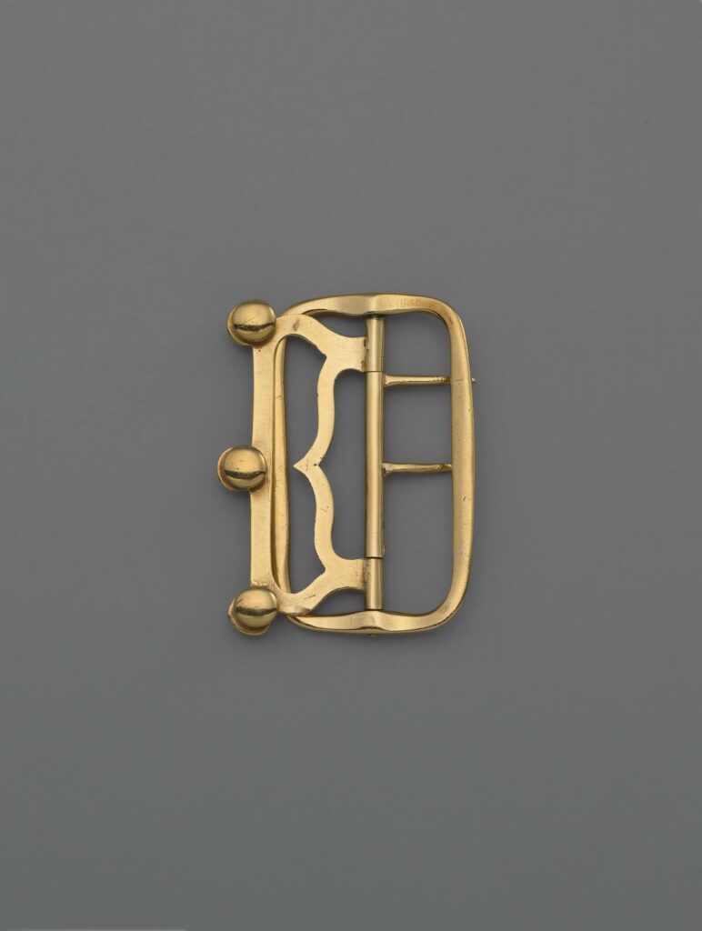 If one sets aside the elaborate, elite jewels made for secular and religious leaders, in the past most men’s jewelry in the United States has been utilitarian. In the colonial period, shoe, knee, and stock buckles—flashy though they might have been—were functional elements for the properly dressed male. These items were made of steel, copper, pewter, iron, silver, or gold, depending on the size of one’s purse; some were ornamented with reflective glass “stones,” or paste. A casual survey of paintings by Boston artist John Singleton Copley reveals many of his male sitters wearing such gleaming accessories. Men also wore mourning rings, as recorded in the diary of prominent Salem jurist, businessman, and printer Samuel Sewall (1652–1730), who attended numerous funerals and recorded receiving a total of fifty-seven mourning rings as gifts from bereaved families on those solemn occasions.*