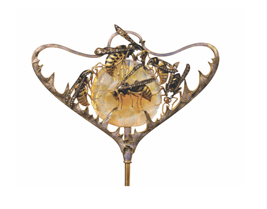 Still, there’s undeniable beauty in the unexpected. When I asked Nick to name his favorite piece of insect jewelry, he didn’t hesitate: a René Lalique hair—or hat—pin set with a mesmerizing central opal, to represent a nectar-laden flower, haloed by wasps. “Imagine it in gaslight,” he said. “It would glow.” Wasps, he explained, are highly unusual in jewelry.