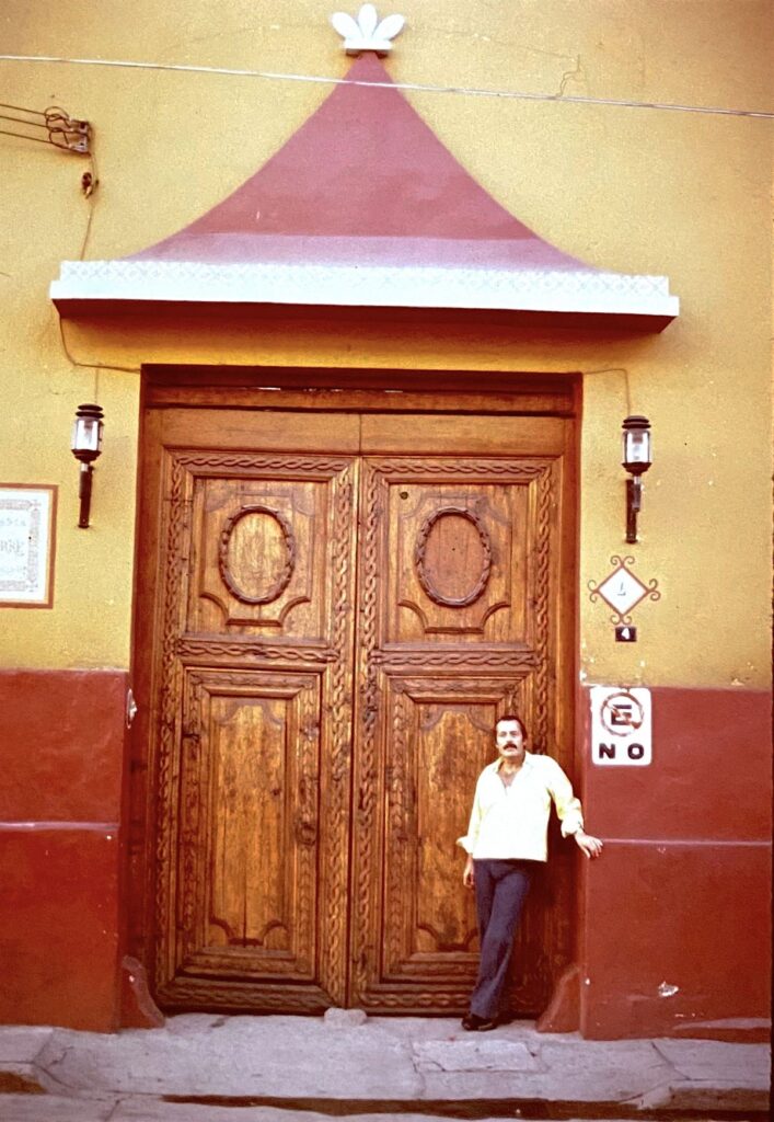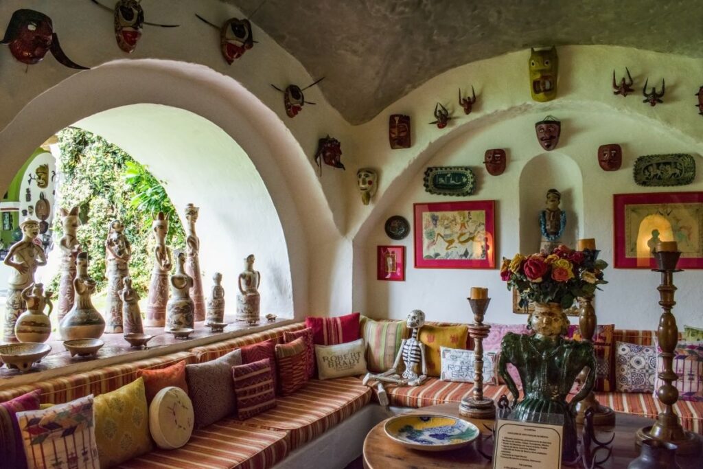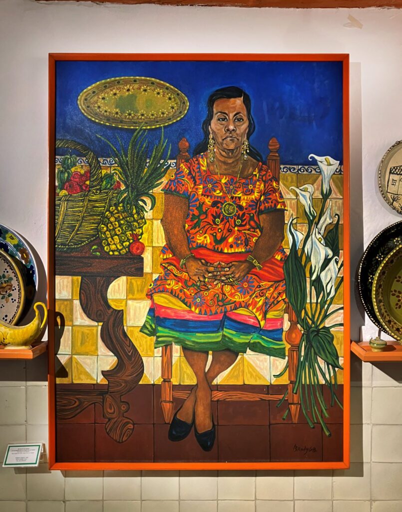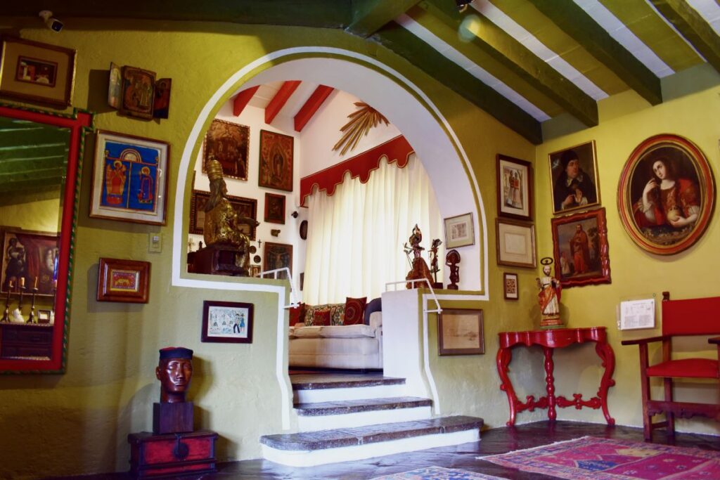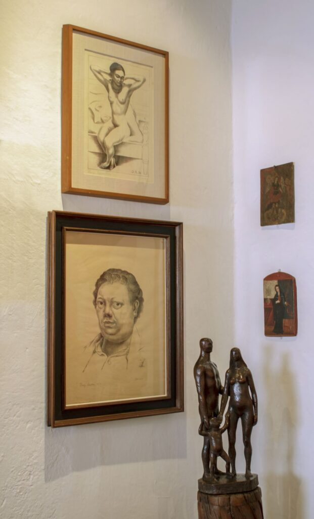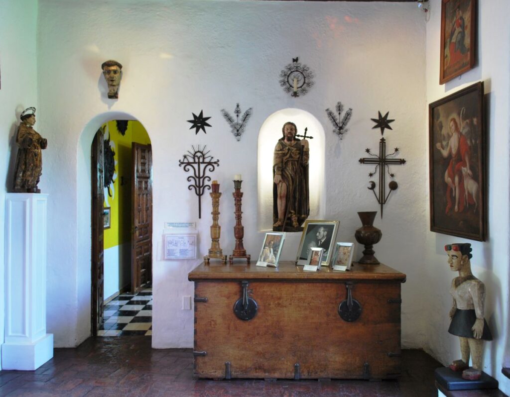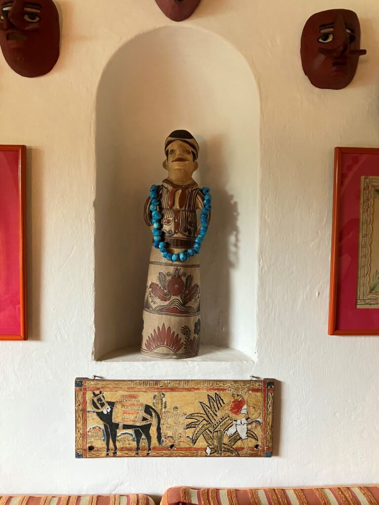 Pushing open the complex’s carved and paneled front doors, and climbing the stairs to the Vestibule, visitors to Casa de la Torre are beckoned into the house’s Cantina by a Day of the Dead skeleton that lounges on a colorfully upholstered wraparound bench (Fig. 6). The figure is fashioned in the style of the Linares family of Mexico City, who’ve made cartonería, or papier-mâché sculpture, their business since the eighteenth century. As he would have done during drinking bouts with his friends, Brady presides here still, if only in effigy. A ceramic figure with his features occupies a niche in the center wall that might formerly have contained a saint or virgin (Fig. 7). Called reinitas de Oapan, or “little queens of Oapan,” hand-modeled figures like this are prepared with cream-colored slip and painted with floral and animal motifs by family-run businesses primarily associated with the village of San Agustín Oapan in Guerrero. Joining the Brady effigy, “queen-ified” members of Brady’s fashionable entourage stand in an arched opening: American actress Paula Laurence, Mexican comedian and actor Cantinflas in his battered felt hat, Brady’s cook María Hernández, and, tallest of all, Peggy Guggenheim, whose oil portrait by Brady hangs upstairs.