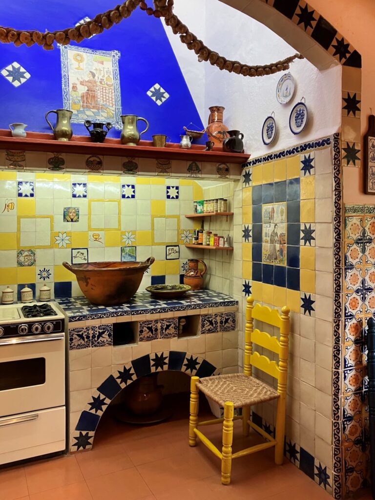 But the heart of the home, as is typical in Mexico, might be the kitchen, where the color and decorative ideas that Brady tried out in different rooms add up to an aesthetic thesis. One enters by way of a modest dining room adjoined to the Loggia, in which are gathered retablos depicting the saint of the kitchen, Pascual Baylón. Pushing open a plank door painted the color of burnt sienna you find yourself in an open, colonial-style space where architectural elements, tiles, and wall-mounted crockery in all the Brady colors come together in a way that’s just right, in both artistic and historical terms (Fig. 20). The crockery is from across the country; the Talavera tiles, an art form that has Arabic roots and was transmitted to the New World via the Spanish, is a craft traditionally linked to certain places in Mexican architecture, primarily church facades and monastery kitchens. For visitors who know, the color and playfulness of these walls beam with the spirit of generations of craftsmen—hands repeating patterns that ancestors’ hands have been making since time immemorial—from across nearly half the world. Undoubtedly, traditional dishes like mole, pozole, atole, and others cooked by María (Fig. 21) in this kitchen received the visual seasoning of the surrounding folk arts, for here one begins to realize that contemplating such works in their natural settings means delving into the customs and traditions, the rituals and celebrations that they are part of, and becoming one with the art.