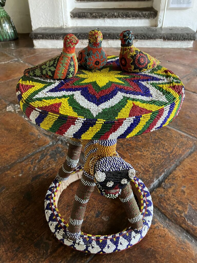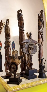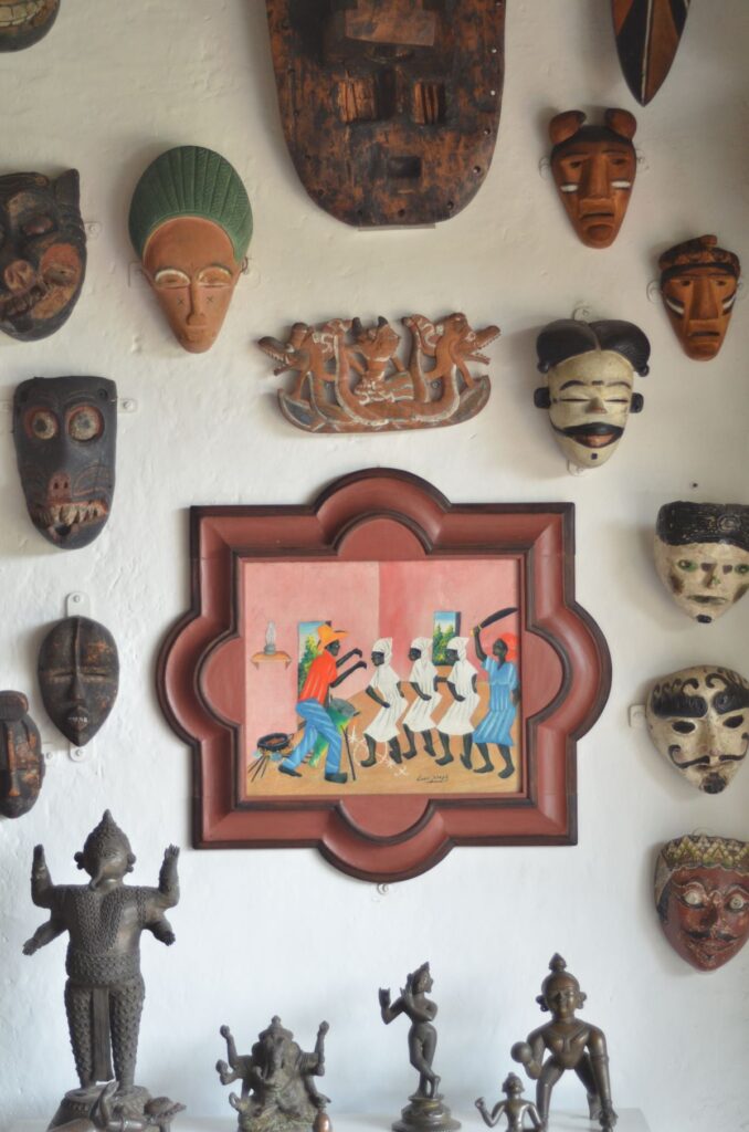 Christened “the city of eternal spring” by Alexander von Humboldt during the German explorer’s sojourn through New Spain at the turn of the nineteenth century, Cuernavaca is also known as “the city behind the walls” for the privacy that its colonial architecture affords homeowners, a quality that has attracted many famous people through the years. At the feasts served in the Loggia, the likes of Maria Callas, Rita Hayworth, Octavio Paz, Rudolf Nureyev, Erich Fromm, David Hockney, and others from the long list of artists, performers, intellectuals, and jetsetters entertained by Brady would have been serenaded by the unpredictable calls of grackles, while their eyes traveled across the hundreds of mostly African and pre-Hispanic objects juxtaposed so that the seemingly unrelated unite in harmony (Figs. 13–15). Yoruba fertility dolls and other ceremonial carvings, Dan masks and the striking kple kple masks of the Baule people—noteworthy for their “modernly” simplified flat, circular faces with projecting round eyes, rectangular mouths, and often with long streamers of hair-like raffia—mingle with Mexican masks from the dances of the diablos and tecuanis. In the best and most subtle juxtaposition, three beaded doves made by the Huichol people of the coastal Mexican state of Nayarit perch atop a beaded stool from Cameroon (Fig. 12)—a tranquil artistic collaboration made possible thanks to the global trade in Murano beads, and by Brady’s impulse to bring together what had been widely dispersed.