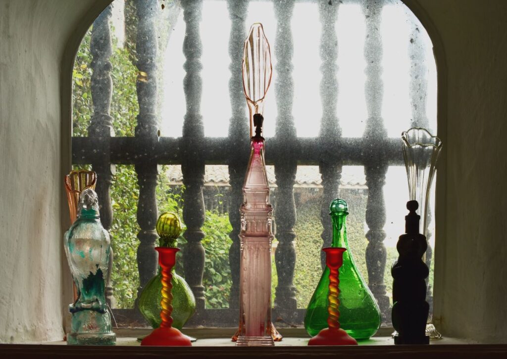 Although far more playful than the installations formerly in Merion, Pennsylvania (for example, the escutcheons, hinges, weathervanes, and other metal implements that serve as a rather severe motif at the Barnes Foundation are replaced here by the warmth of countless painted and weathered wooden crosses), Brady’s ensembles at Casa de la Torre nonetheless exude Barnes’s influence. But if it was in the West that artists and intellectuals first began to re-evaluate the relationship between the fine and folk or functional arts, the idea took wing in Mexico. There, following the revolution, European-taught Mexican artists like Roberto Montenegro, Dr. Atl, Manuel Rodríguez Lozano, and the Big Three muralists—Diego Rivera, José Clemente Orozco, and David Alfaro Siqueiros—returned to exalt the nation’s rich popular art traditions, and incorporate them into their own creations. Many of these artists are represented in Brady’s collection of graphic art, on display down the hall from the Cantina. A jowly Rivera self-portrait from 1930 is paired with his naïvely proportioned nude study of Frida Kahlo from the same year (Fig. 9). Orozco’s lithograph of Zapatistas—partisans for Emiliano Zapata, agrarian hero of the Mexican Revolution—hangs on the wall opposite, sandwiched between a pair of woodcuts by Rufino Tamayo; while Siqueiros’s tenebrous portrait of the American-born “father of Mexican Silver,” William Spratling, glowers from a corner next to Two Sailors by Otto Dix. All these masterworks of modern art hang equitably with their folk-art ancestors and coevals: votive paintings, simple wooden crucifixes, a windowsill crowded with colorful Italian glass (Fig. 11), a Navajo rug, and a tapestry depicting a flowering cactus, designed by Brady and woven by a family of craftsmen from Chiconcuac in the Valley of Mexico.