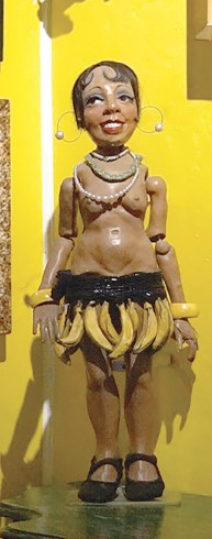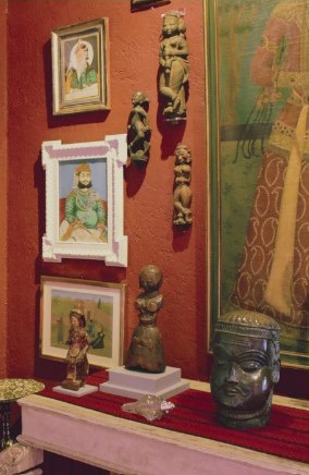The Oriental Bedroom is accessed from the vibrant Yellow Room, Brady’s preferred space for entertaining (Figs. 17–19). It’s decorated with paintings either made by women or depicting them—Frida Kahlo’s Self-portrait with Monkey, The Zeppelin by María Izquierdo, Brady’s portrait of Guggenheim, Old Queen Cotton by American folk artist Horace Pippin, an altar to Baker (with grinning, banana-skirt-clad articulated doll)—all surrounded by African and South American tribal pieces. In front of brass and wood staffs from Burkina Faso and Mali, textiles, and a trio of what look something like totem poles (ceremonial figures from the Maprik yam cult in New Guinea) there is a squatting figure in wood and brass repoussé (Fig. 18). Decades before it appeared in this room Guillaume Apollinaire published a similar figure in his epochal Sculptures negrès of 1917, in which he declared the value of thinking about and looking at such African sculptures as art rather than merely as ethnographic material. Arrayed here with obvious care taken to their formal properties—their verticality, their weathered look like old driftwood—it is clear that Brady felt the same way about the African and other pieces in his collection, but he found a way to incorporate their makers’ intentions as well: in this room of women many of the figures and objects relate to fertility rituals.