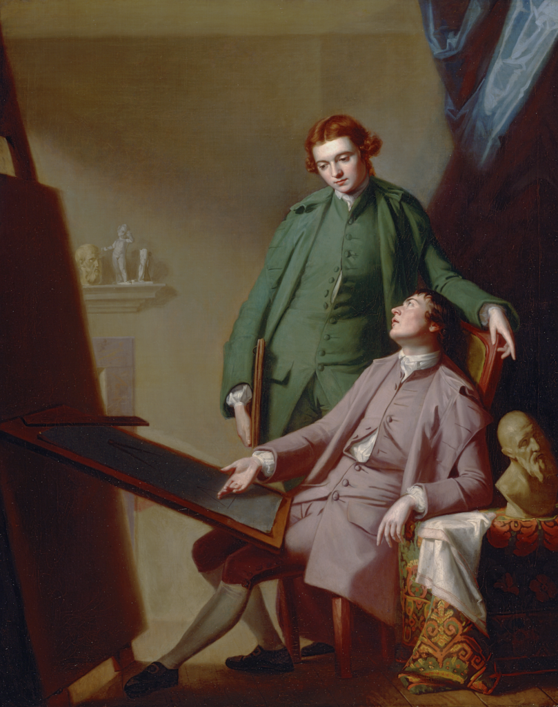Admittedly more adventurous is Romney ’s Conversation, a portrait of his brothers Peter and James from a few years earlier. Set between an easel and an indigo curtain, the scene depicts one brother, seated with a drawing board on his lap and clad in a puce coat, explaining some point of art to his standing, green-robed sibling.