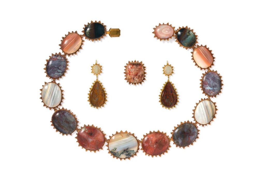 The abundance, strength, and exuberant beauty of agate have made the storied hardstone a favored material of makers back to ancient times. As long as there have been stonecutters creating objects and jewelry, agate has been at the heart of their production, found in neolithic beads, Roman seals, Renaissance tables, Regency necklaces, and modern jewelry. Common enough to be picked up from a riverbed on a hike, in the hands of a master lapidary and goldsmith agate can become extraordinary, like this nineteenth-century necklace featuring the translucent stone.