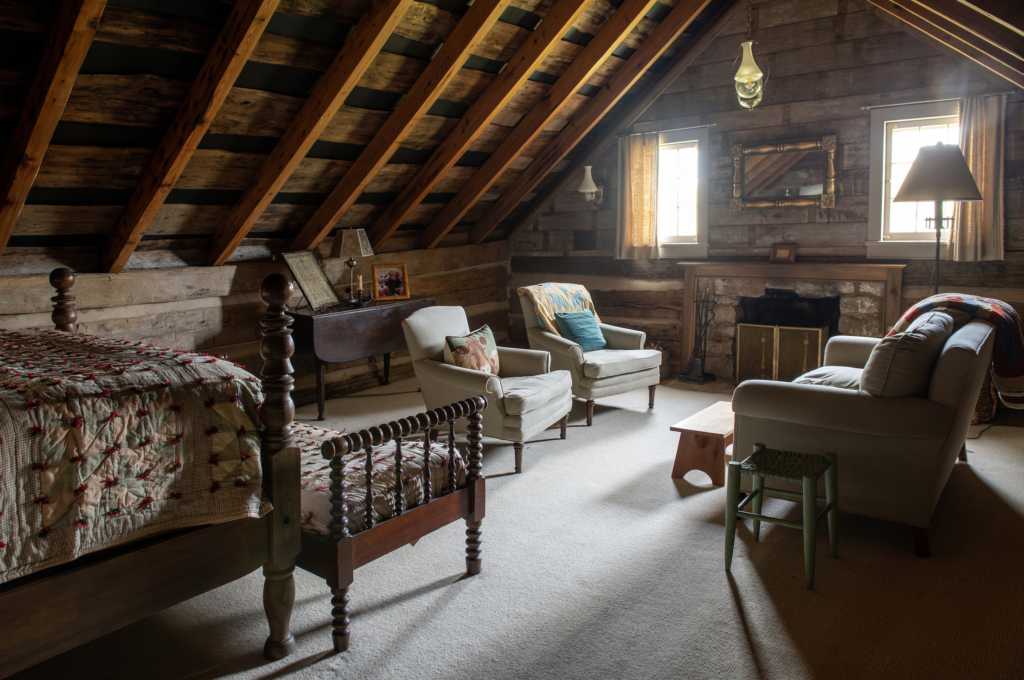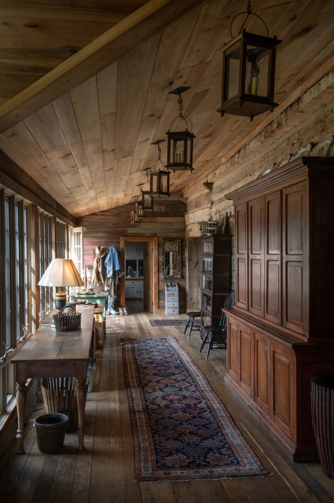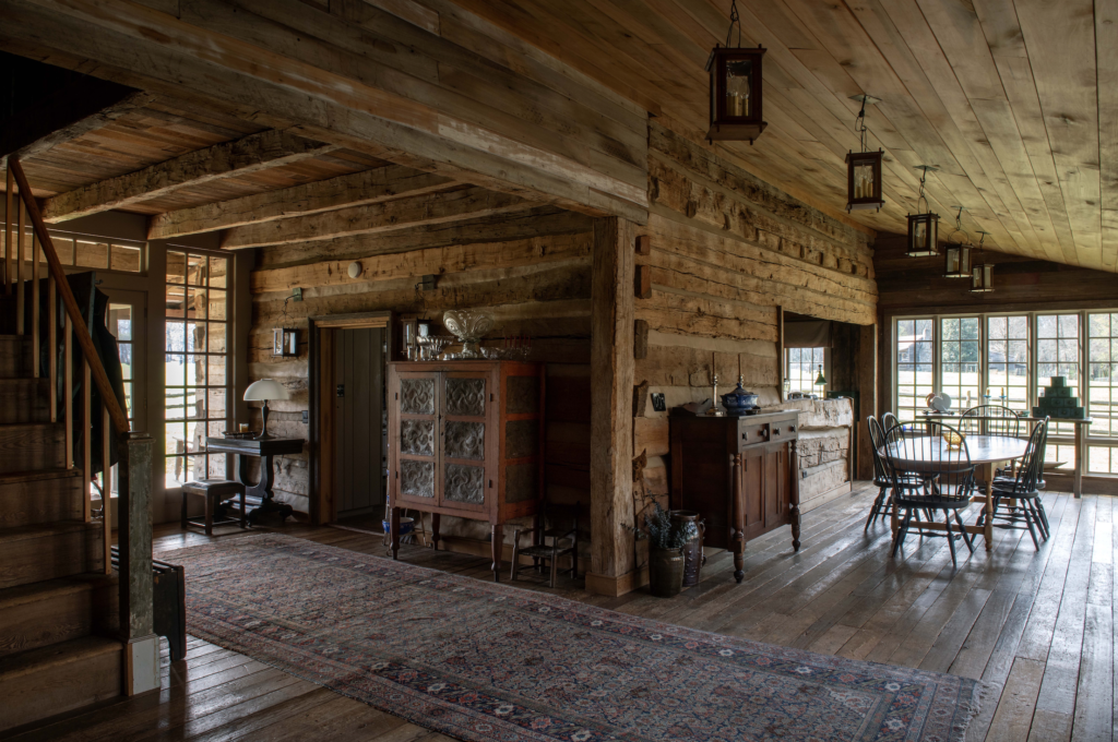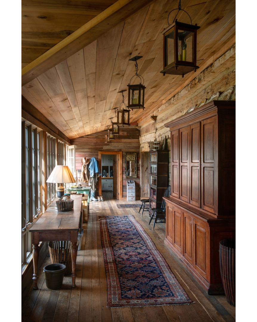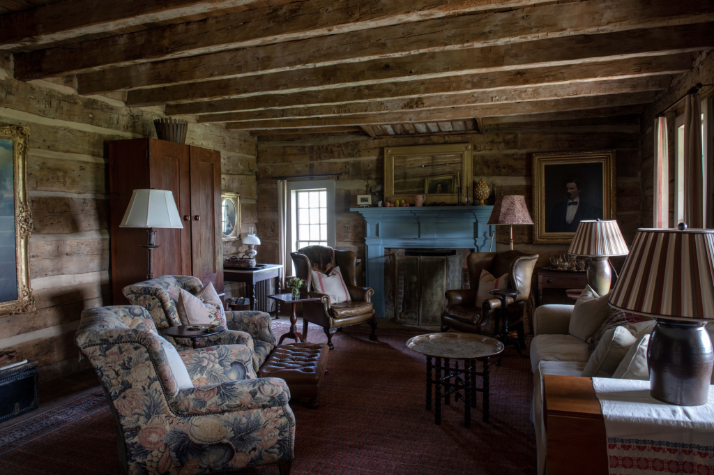 Construction took around eighteen months, and during this time, O’Neal was overseeing everything from afar, as she was living with her husband and son in Australia. In fact, O’Neal has never lived in the Florence log house full-time, though she tries to spend around half the year on the property. It has been thoroughly updated for modern living, with the 1860s cabin serving as the living room, kitchen, and homeowners’ suite, and the 1820s cabin housing the study, her son’s room, a spare bedroom, and the TV room. The section at the right, which joins the two halves of the home was transformed into a sunny dining area. O’Neal also added a screened-in porch—one of the few incongruous elements on an otherwise historically sensitive exterior. But, as with the air conditioning, she felt that certain amenities were worth it.