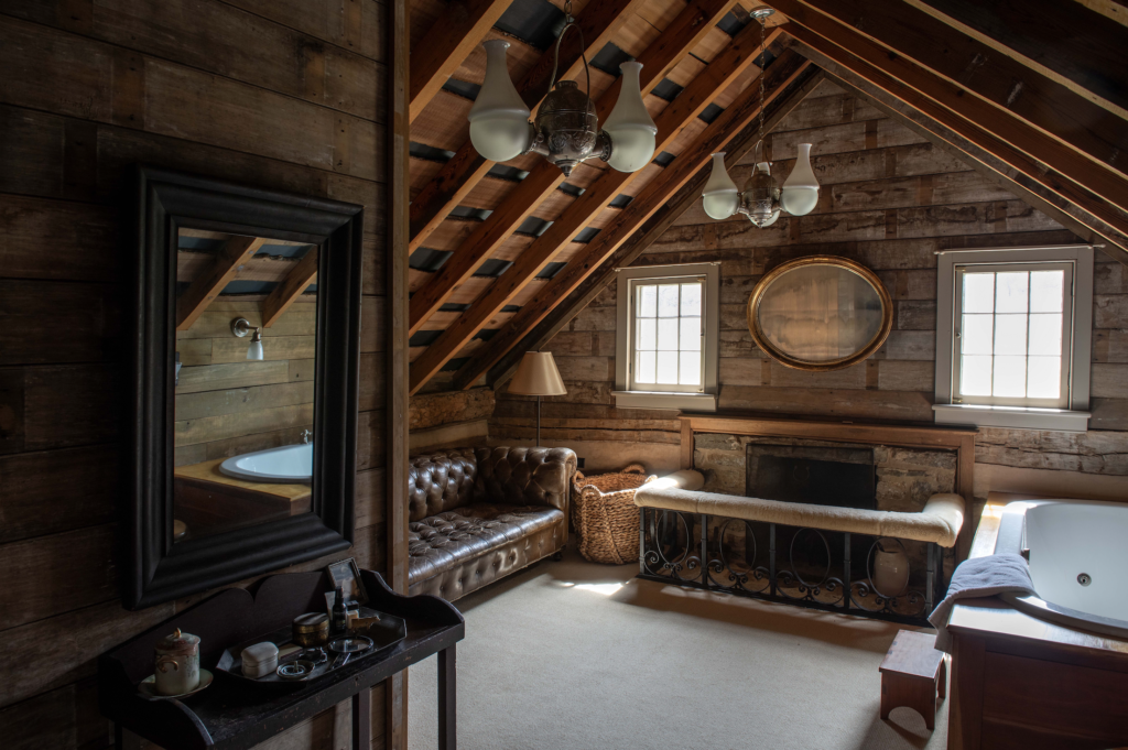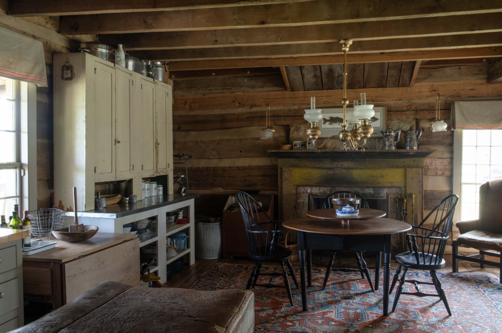 Inside, O’Neal turned her sharp eye to sourcing antiques that would not only fit with the cabins’ backstories, but also with the family’s local lineage. “In the living room is probably where I feel the influence of history most strongly,” she says. “The people we bought the cabin from had taken out one of the mantels and put it in their own house. Obviously, I couldn’t very well say, ‘Hey, give me that mantel.’ But I did ask if we could copy it.” She chose to paint the reproduction sky blue, a color that would certainly have been in use in the 1860s, and which echoes in small moments throughout the house.