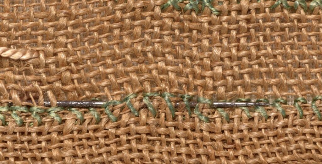 Cones/ Sampler Age 10” near bottom center and right. Silk on linen, 10 3/4 by 10 1/2 inches. Norfolk Historical Society.