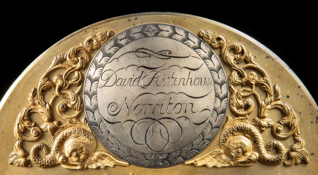 The signature method was advanced at the 2016 “Clocks at Winterthur” symposium that this reviewer organized for the National Association of Watch and Clock Collectors. The late Jeffrey Lock, a specialist in early engraving and a restorer of Rittenhouse surveying instruments, spoke of his detailed analysis of Rittenhouse signatures. His assertions, controversial and unpopular with owners of questionable clocks, did not account for engraved dials that the authors attribute to professional local engravers employed by the Rittenhouses, including Henry Dawkins and John Norman. However, engraved signatures were judged spurious if they had improper or amateur scripts, spellings, or abbreviations. An archaic long s, looking like an f in older writings, also was judged evidence of fakery. An April 1932 exhibition at the Historical Society of Pennsylvania commemorated the two hundredth anniversary of David’s birth. Sixteen clocks were displayed: fifteen by David, one by Benjamin. Seven of the twenty clocks in the new book’s Catalogue were in that show, providing further evidence of their authenticity.