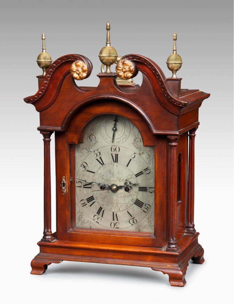 No criticism of Benjamin Rittenhouse, this acknowledges that American makers used imported English horology to satisfy consumer requests and offer less-expensive alternatives to complete clocks from London. At Winterthur, the movement of a similar table clock by Edward Duffield, a Philadelphia clockmaking contemporary, was stamped by London eighteenth-century clockmaker Thomas Best.