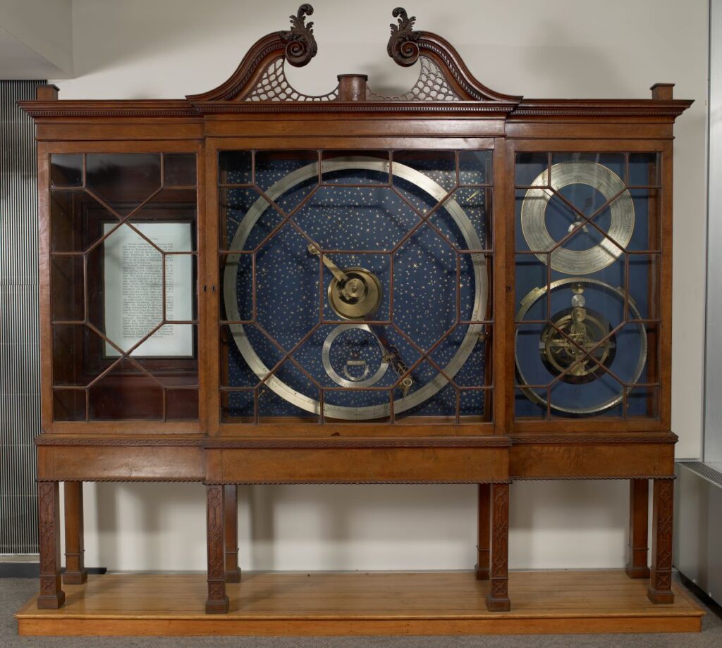 David Rittenhouse may best be known for his two large orreries and two preceding clocks with moving models of the solar system. All four can be admired in person. The large vertical orreries—intended for classroom instruction—are, respectively, at the University of Pennsylvania and at Princeton University, although the latter is incomplete. The two clocks are at Drexel University—a musical version—and at Pennsylvania Hospital. The larger machines originally were intended to be driven by clockworks rather than by hand-cranking, but Rittenhouse determined that to drive all the gears he would need movements the size of those in church towers.
