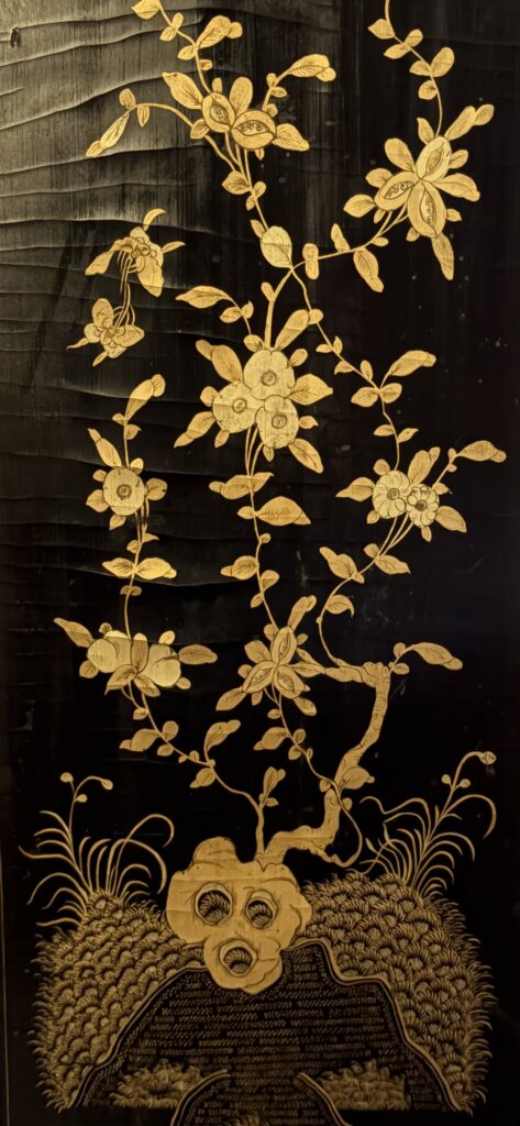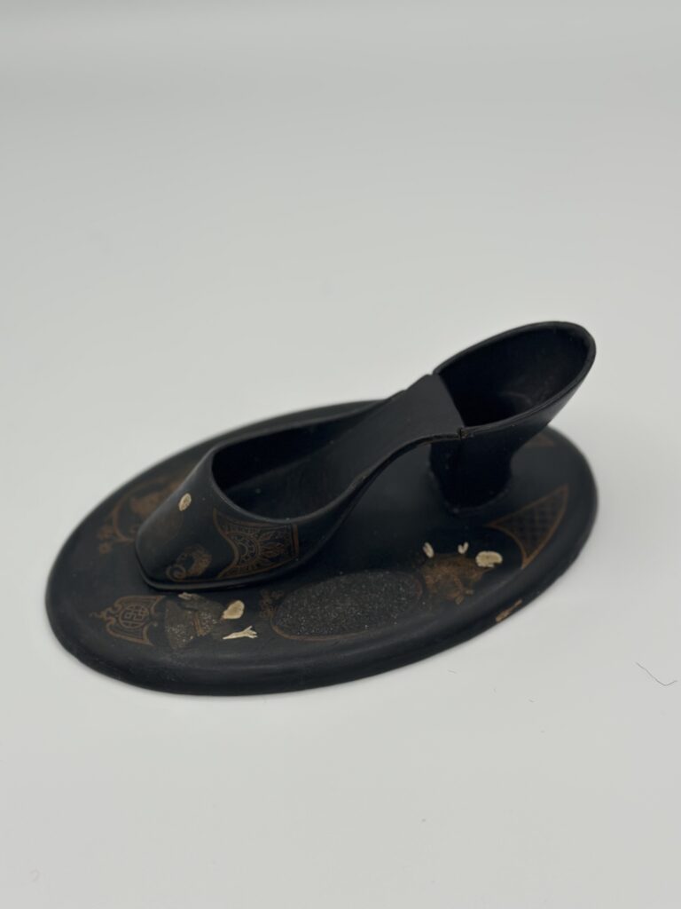 A Chinese export secretary found at Butterscotch Auction, in the hamlet of Pound Ridge, New York, stands in my office. On a nearby windowsill is a Finkelstein find, purchased from Litchfield Auctions in Litchfield, Connecticut: a match striker, shaped like a Victorian lady’s shoe, era unknown. Our flat-screen television is also hidden within a 1940s lacquer cabinet that was a bar. My husband and I own wall pockets, letter organizers, wall brackets, crumb catchers, pipe holders, and boxes, all coated in black and decorated with golden flowers and chinoiserie figures wearing elaborate costumes.